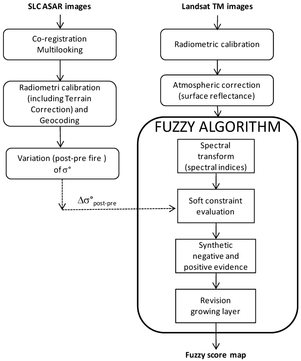 Figure 3 shows the flowchart of the steps implemented for data pre-processing and image classification (thicker black box). Pre-processing of optical and SAR data are described in Section 3.1 and Section 3.2, respectively, whereas the details on the implementation of the fuzzy burned area-mapping algorithm are provided in this section. As shown in Figure 3, the ∆σ° and surface reflectance Landsat-5 TM images constitute input data for the fuzzy algorithm [,,].