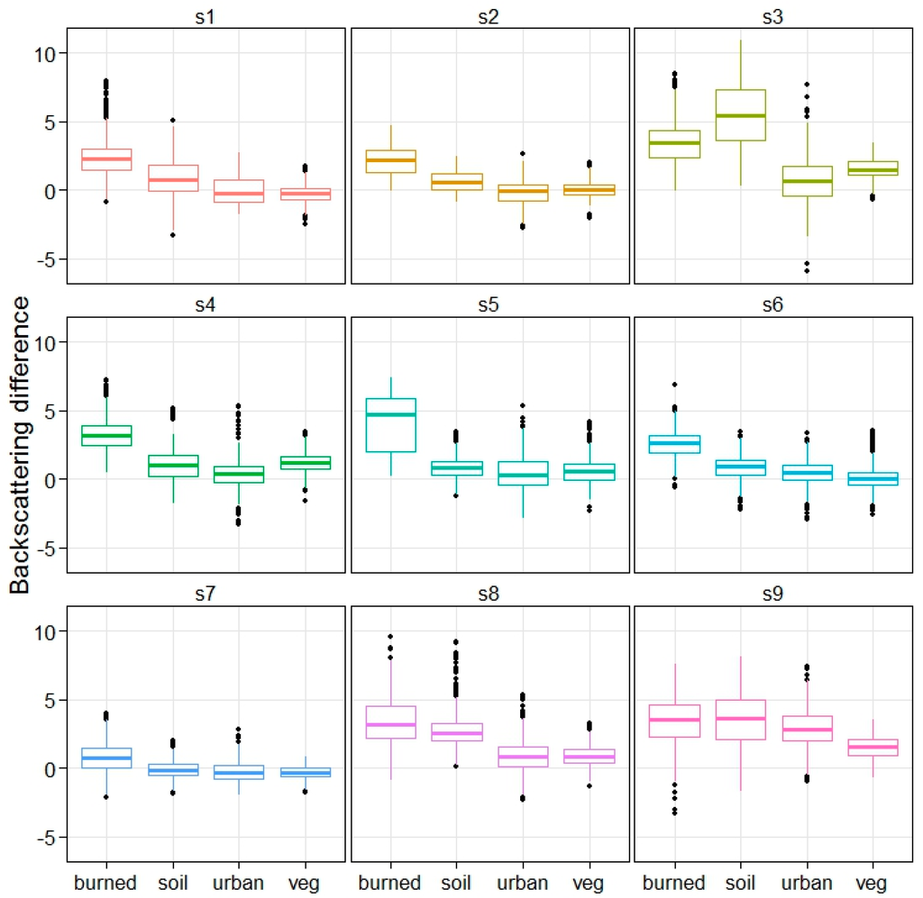 Boxplots (median, interquartile range, maximum and minimum values and outliers) of ∆σ° (dB) for burned, soil/sparse vegetation, urban and unburned vegetation surfaces over the SAR frames s1–s9.