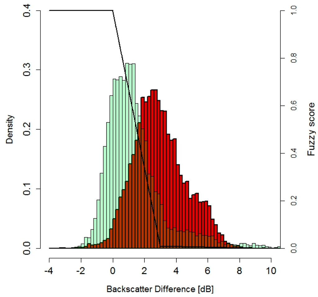 Figure 5 shows the ∆σ° histograms for burned (red) and unburned areas (unburned forest, soil/sparse vegetation, urban all together) (light green) extracted from the training dataset. Based on the above-discussed results, the fuzzy membership function of the negative evidence for the ∆σ° (μ∆σ° is defined as follows: