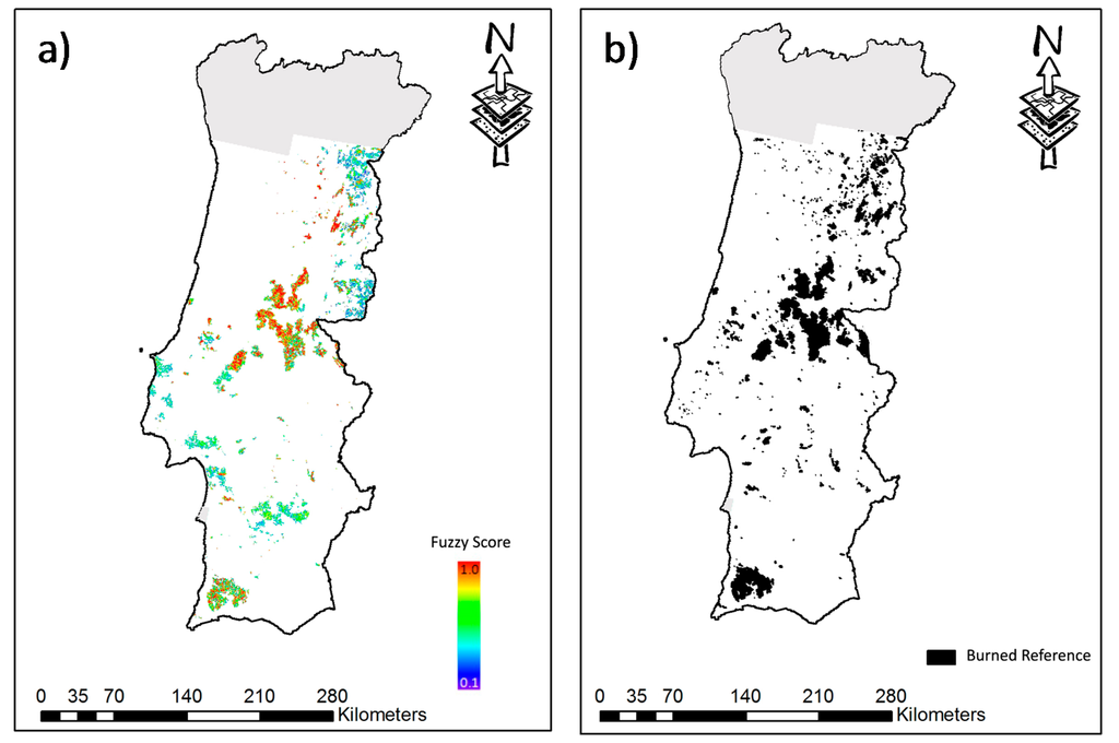 The aim of this paper is to investigate how the distinctive features of the information conveyed by optical and SAR data can be combined to identify burned areas, specifically through the development of an integrated multi-source framework for burned area maps production based on a fuzzy algorithm. This framework is an extension of the automated algorithm originally proposed for Landsat TM/Enhanced TM plus (ETM+) data, based on the use of fuzzy sets theory and a region growing algorithm [,]. This paper is mainly focused on the study of Mediterranean-type regions, particularly on Portugal, affected by remarkable fire events during the year 2003. It is worth remarking that Portugal has been chosen being one of the few countries provided with operational programs for the systematical mapping of burned areas []. A multi-temporal analysis (including pre- and post-fire acquisitions) has been conducted by employing both Landsat-5 TM and (C-band) ENVISAT ASAR data to properly integrate the optical indices and scattering signature into the considered fuzzy algorithm to exploit the complementary features of optical and SAR information. Burned area maps have been derived and compared to fire perimeters from the fire atlas available for Portugal, covering the period from 1975 to 2009 and derived from Landsat imagery, to evaluate the contribution of SAR-derived information.