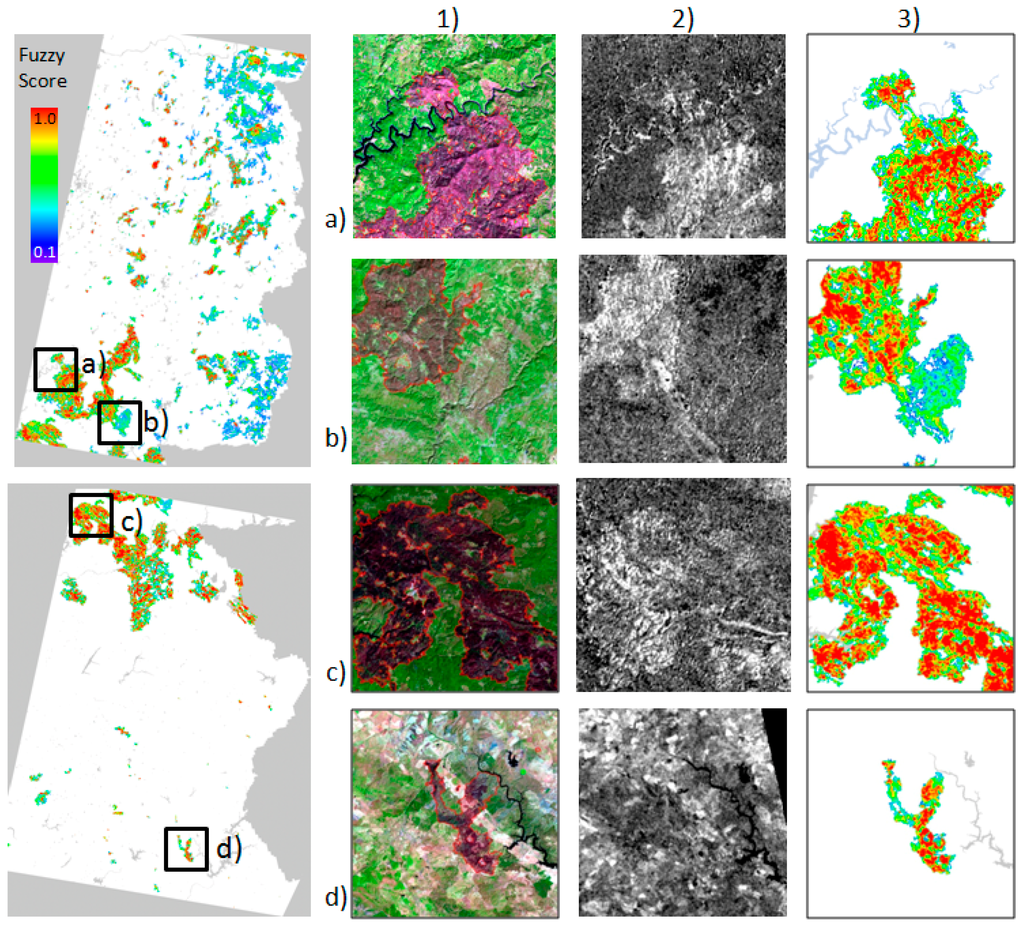 The analysis of the contribution of SAR data to the accuracy of the final burned area map was carried out at the regional and local scales. Results show that ∆σ° images introduced into the fuzzy algorithm can correct for erroneously identified burned areas and thus reduce commission errors. This effect is particularly evident when clear sky optical images are not available (high incidence of could shadows) and where low albedo surfaces (e.g., wetlands) are present and not masked out with external information on the land cover. As a consequence, the contribution of the optical + SAR integration can be significant. This result is of particular interest for applications in tropical regions, where cloud cover can be persistent and forest and deforestation fires can produce a significant amount of trace gas emissions due to the high woody fuel load. Further developments could be implemented to exploit the potentiality of SAR data as positive burn evidence, at the same level of the input optical spectral indices. In this perspective, SAR data operatively become an alternative source of information in absence of optical data due to, for example, persistent cloud cover. Moreover, further work will be carried out to investigate the relationship between the fuzzy score and the characteristics of the burned surfaces, such as burn severity. The proposed fuzzy algorithm proved to be flexible and robust and it could be a methodological framework suitable also for testing SAR data acquired at longer wavelength that might provide more separability of the burned surfaces. It will also be suitable for testing data made available by future satellite missions, such as for example, the ESA-Sentinel 1 and 2.