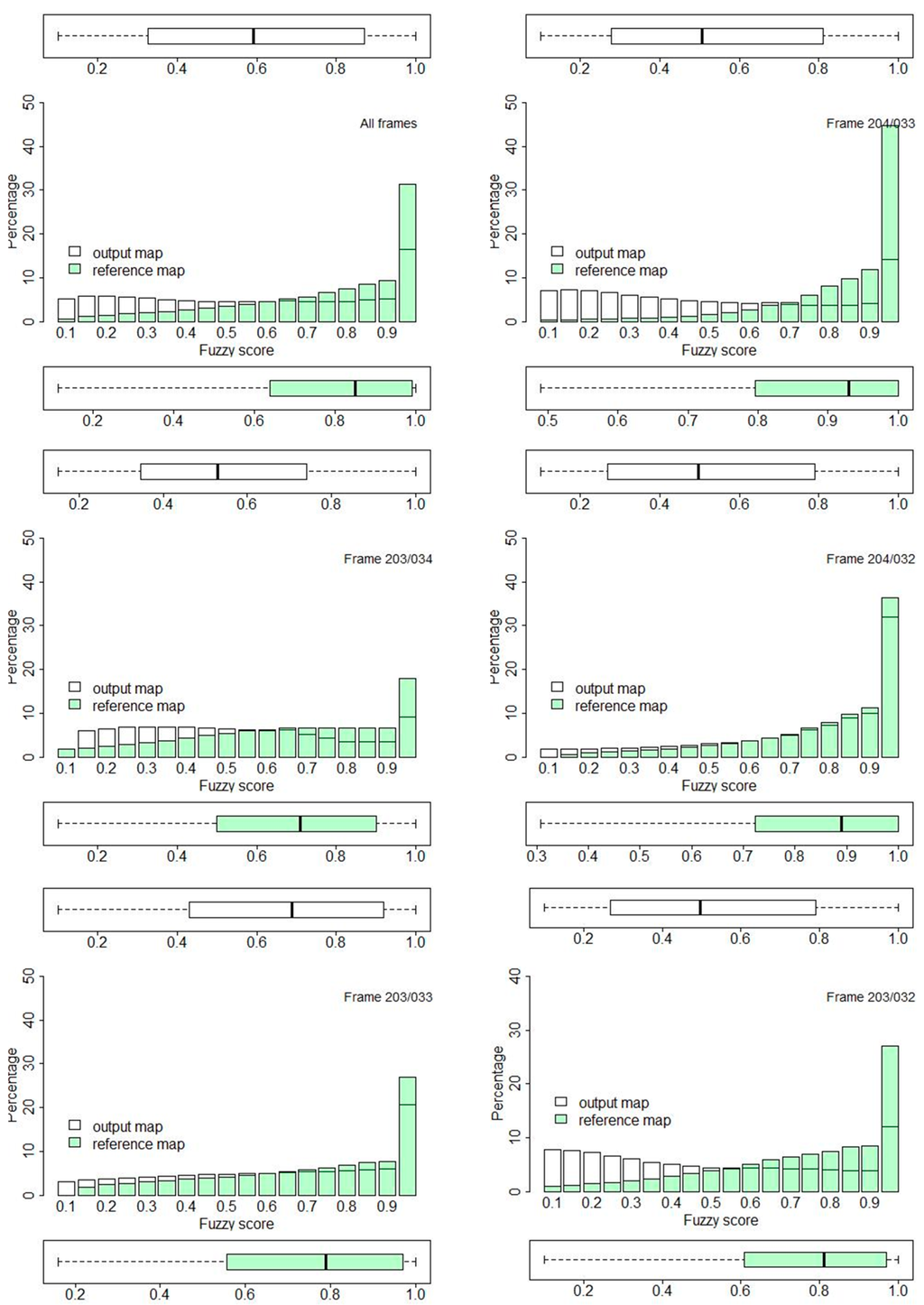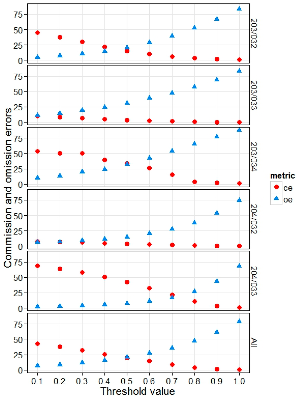 The variability of the burned area map accuracy as a function of the threshold applied on the fuzzy score was analyzed by assessing commission and omission errors and the kappa coefficient for a set of thresholds in the range [0.1, 1.0]. As stated in Section 4, overall accuracy is not a reliable metric for comparing classes with unbalanced size, and is, therefore, not discussed in this study. Figure 9 shows the omission (OE, light blue triangle markers) and commission errors (CE, red circles) computed from the confusion matrix as a function of the threshold applied to the fuzzy score map for each TM frame and all frames together.