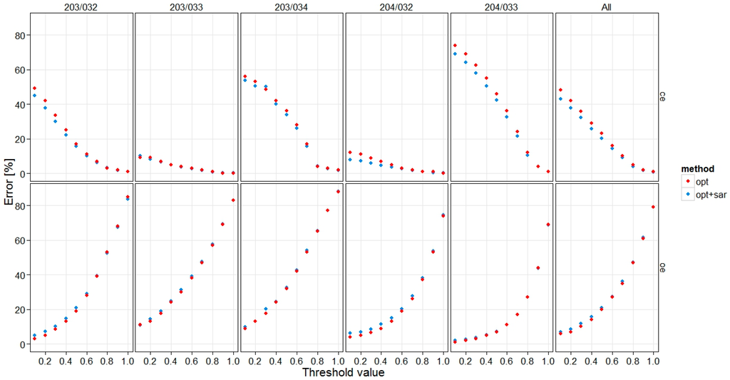 The commission (top row) and omission (bottom row) errors (%) as a function of the threshold applied to the fuzzy score map, derived with only optical (red markers) and optical + SAR data (blue), for each TM frame and for the study area as a whole (last column).