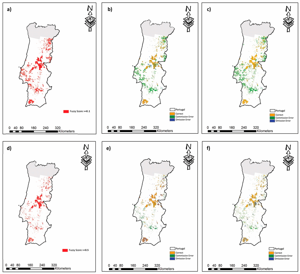 (a–c) the optical + SAR burned area map (first column) and its accuracy map (second column) compared to the accuracy of the burned area map derived with only optical data (third column) in the case of threshold of the fuzzy score 0.1; (d–f) the same for the case of threshold of the fuzzy score 0.5.