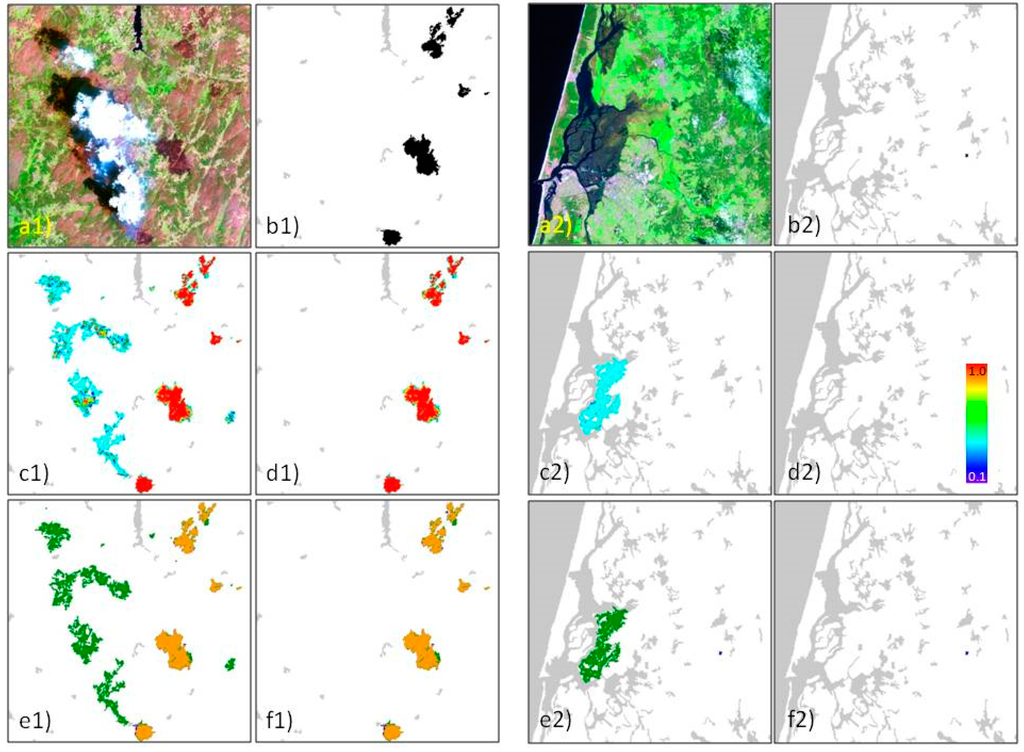 When the optical information is poor a significant performance degradation could be observed when only optical data are processed due to the spectral confusion between burned areas and low albedo surfaces []. In Figure 12, two examples are considered, where cloud shadows (example 1) and wetlands (example 2) are present and the performance of the algorithm relying only on optical data is poor. However, by complementing it with the SAR contribution, in both cases (d1, d2), a significant reduction of the commission error is obtained, with respect to the case in which only optical data are used (c1, c2). For instance, in the first example, the commission error decreases from 65.4% (optical only) to 11.4% (optical + SAR). These simple examples demonstrate the importance of an integrated framework for processing optical and SAR data for burned area mapping.