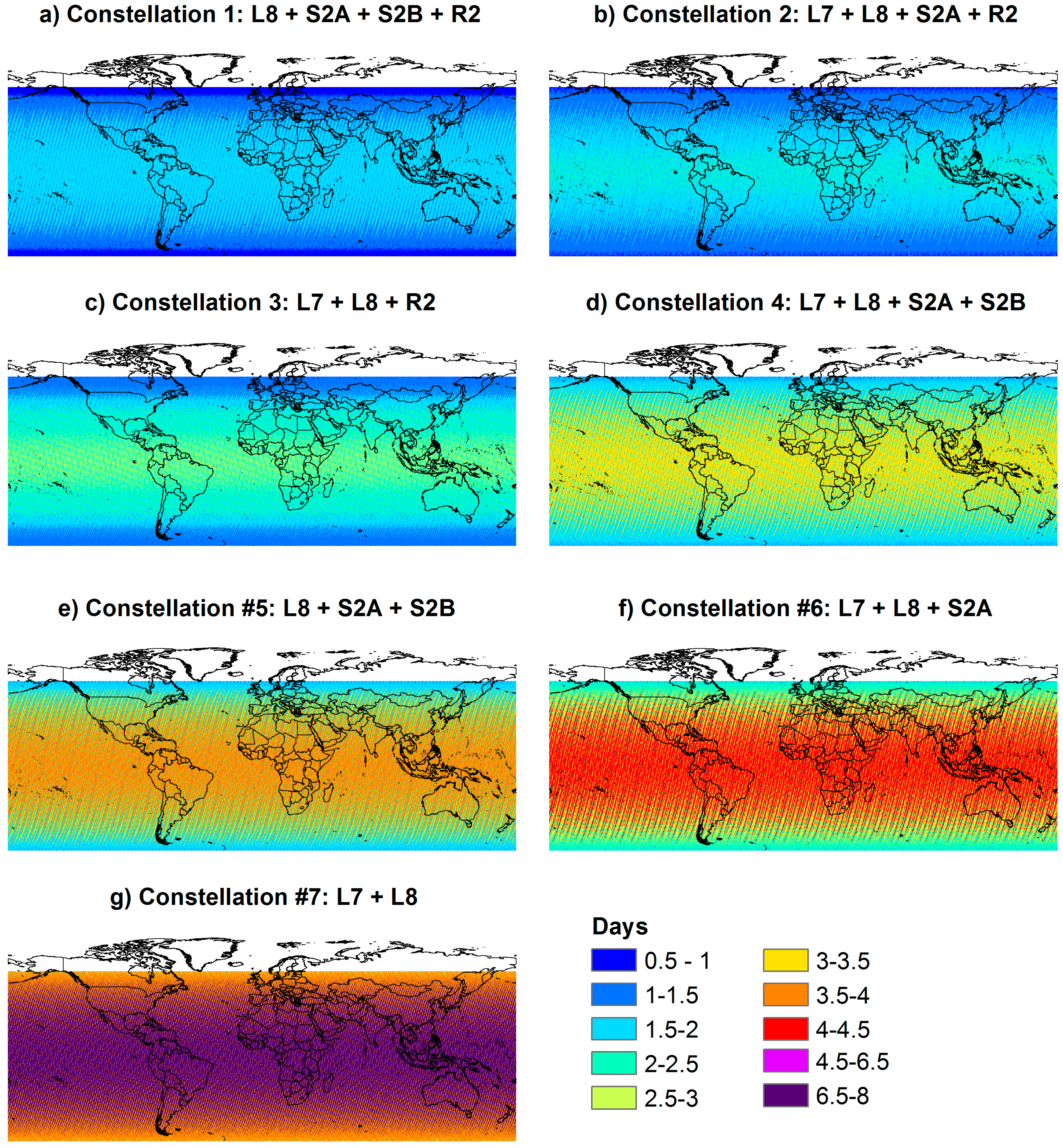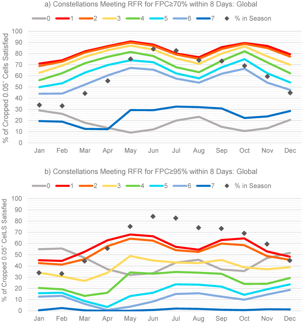 Whitcraft et al. (this issue) [1], shows the revisit frequencies required (RFR) to yield a reasonably clear view (defined as having a final percentage clear (FPC) of at least 70%, 80%, 90%, or 95%) within 8 days over in-season (actively cropped, as defined by agricultural growing season calendars in Whitcraft et al. (2014) [48]) 0.05° agriculture-containing cells (as defined by the cropland mask in Fritz et al. (2015) [49]). For views at least 70% clear within 8 days, 44%–55% of in-season cropped cells worldwide (depending on the month) would require a revisit more frequent than 4 days, respectively. For views at least 95% clear, if data are required within 8 days, a revisit frequency of less than 4 days would be required in 76%–99% of actively cropped cells (depending on the month). Full dataset inputs, methods, results, and discussion regarding the derivation of these RFRs can be found in the accompanying manuscript. In this present manuscript, the focus is evaluating whether the mode (most common) revisit capabilities of each of the seven constellations introduced in the previous section (resampled to 0.05°) are frequent enough to meet the RFRs to yield a view at least 70%, 80%, 90%, or 95% clear within 8 days for each 0.05° cell. The FPC ≥ 70% case and the FPC ≥ 95% case are further highlighted as upper (“best case”) and lower (“worst case”) approximations, respectively, of our ability to meet this 8 day requirement for reasonably clear optical data.