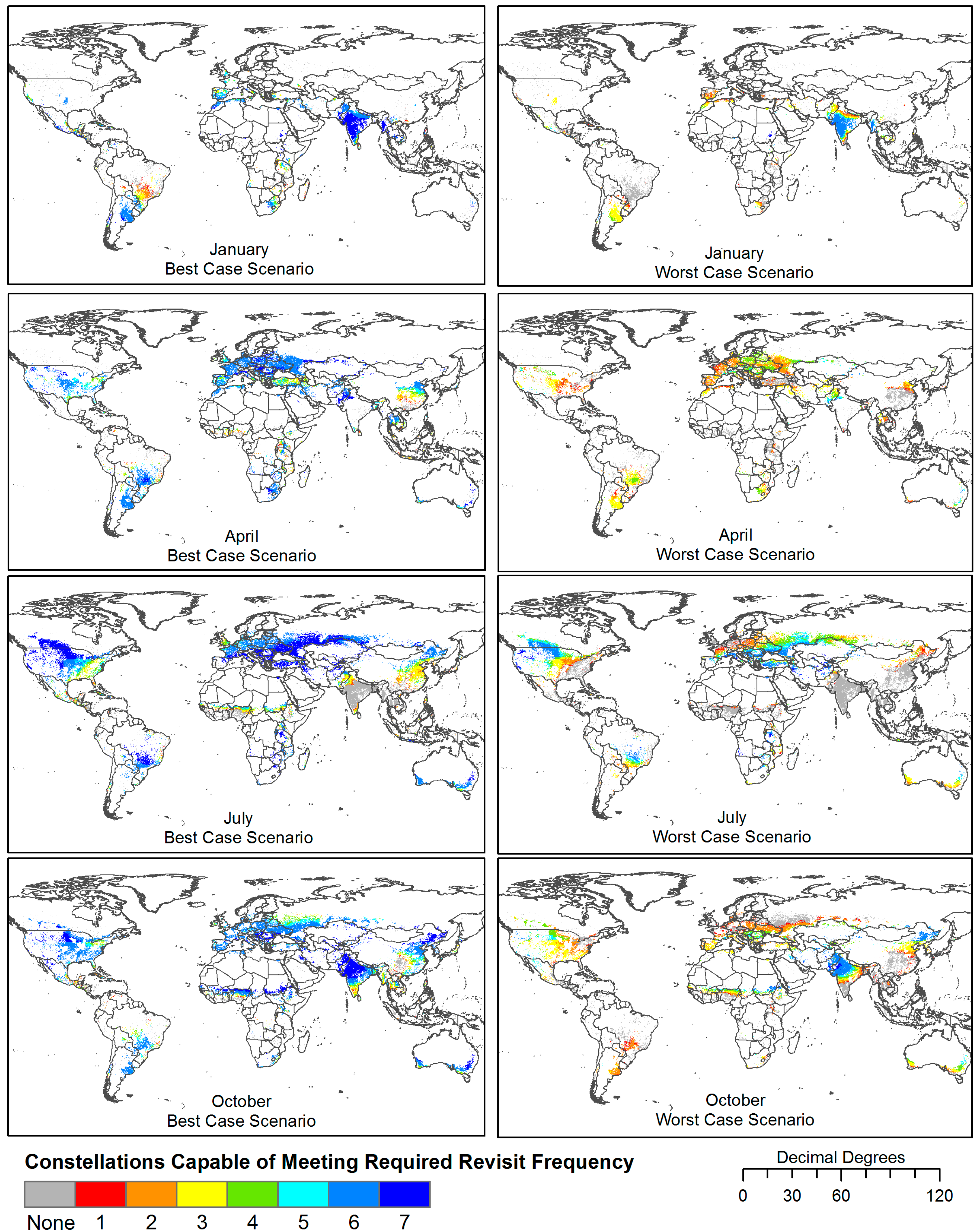 The analysis presented herein shows the strength of combining multiple satellite missions to form an imaging constellation. Combining missions from two or three different space agencies leads to greatly improved revisit frequencies and an improvement in our ability to meet our EO requirements for global agricultural monitoring, although key gaps exist in pervasively and persistently cloudy regions. The extent and severity of these gaps in capability depend largely on the degree of acceptable cloud cover, and as such, research to pinpoint the precise definition of “reasonable” cloud cover for each agricultural monitoring application should be prioritized.