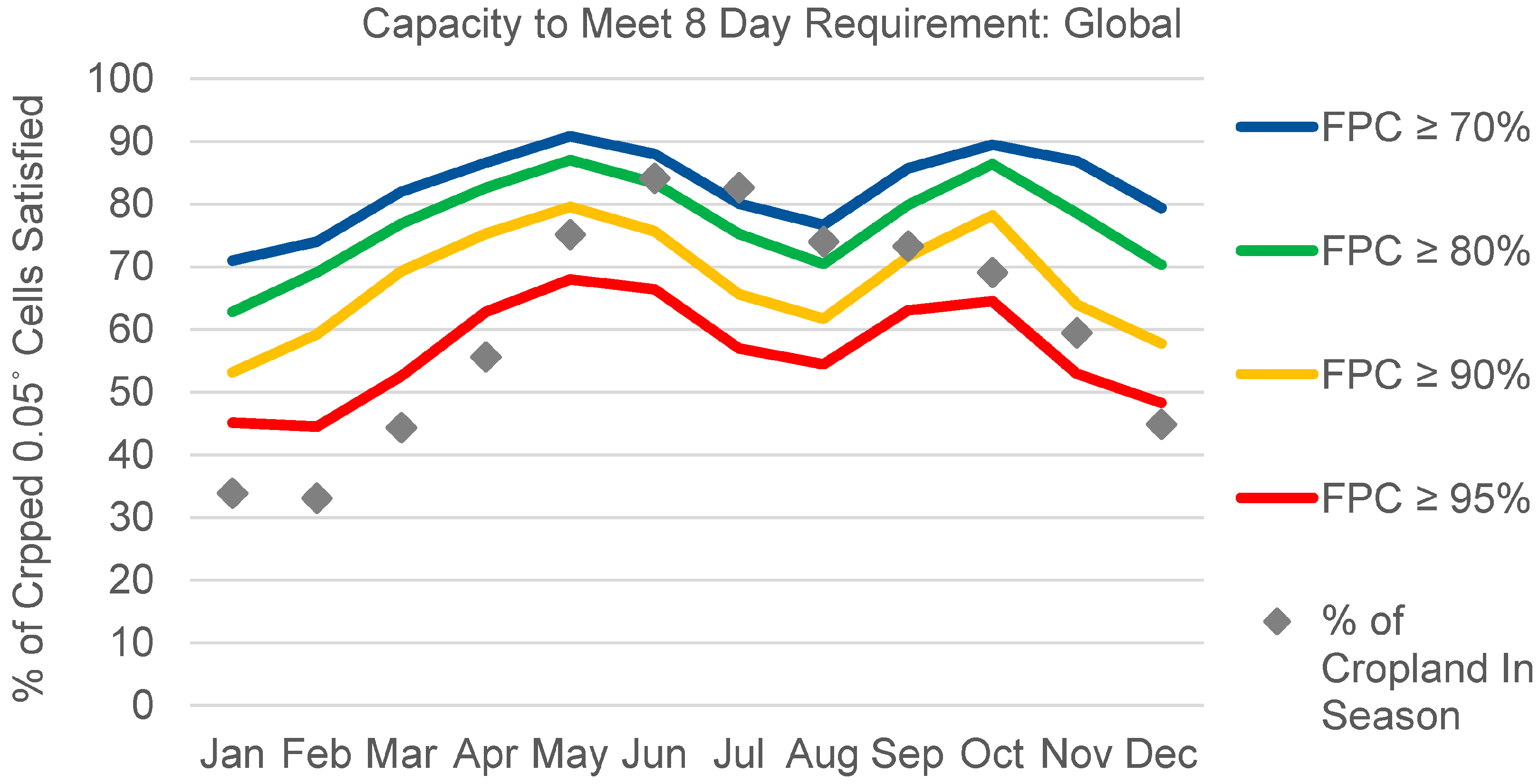 The overall capacity to meet an 8 day data requirement for data at least 70%, 80%, 90%, or 95% clear (FPC), as introduced in Whitcraft et al. (this issue) [1]. “Capacity” corresponds with the percentage of total actively cropped 0.05° cells which have their revisit frequency requirements satisfied by at least one constellation (i.e., the best/most frequent performer, Constellation #1). To provide perspective on the relative cropland area requiring imagery for each month, also plotted is the percentage of total global croplands which are in-season during each month, as indicated by Whitcraft et al. (2014) [48] and Fritz et al. (2015) [49].