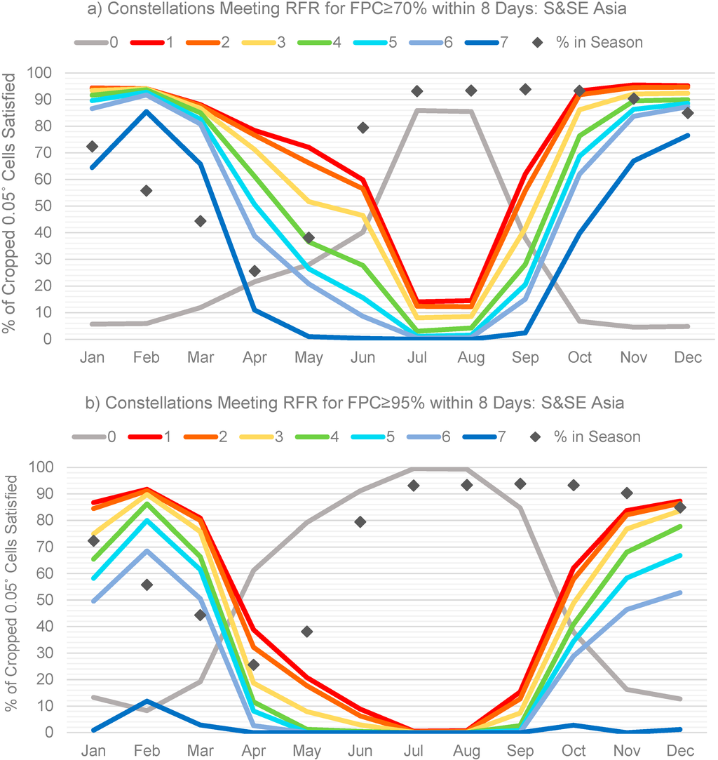An analysis of this region shows a very large difference between the best (Figure 5a) and worst (Figure 5b) case scenarios during the middle of the year (April-September), although the general shapes of the curves are similar. This is due to the effects of the Indian Summer Monsoon, during which cloud obscuration is both pervasive and persistent [50]. As seen in Figure 5a, the success rate for the best case scenario for even Constellation #1 during July and August hovers around 15%, meaning approximately 85% of actively 0.05° cells are left without a view that is even 70% clear. Exacerbating this situation is the fact that July and August are among the most pervasively cropped months of the calendar year, meaning these requirements are unmet, not just at a higher rate but over a larger area. The outlook is even poorer in the worst case scenario (Figure 5b), where even Constellation #1’s success rate stays below 10% from June until September. However, from October through March, the cloud cover declines considerably and the success rates for multiple constellations are quite high. In this (and other) areas so seasonally impacted by cloud cover, SAR data alone and/or optical-SAR fused data should be further explored and implemented for agricultural monitoring [51,52,53].