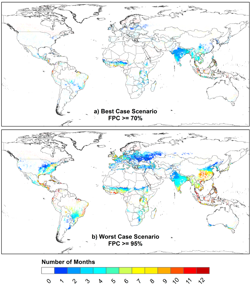 As of late 2014, Landsat 7 and Landsat 8 acquire the only freely and openly available moderate resolution data. Their combination, Constellation #7, even in the FPC ≥ 70% (“best case”) scenario (Figure 4a), can only meet an 8 day revisit requirement in 12%–32% of actively cropped 0.05˚ grid cells, and in virtually 0% of actively cropped cells for all months in the FPC ≥ 95% (“worst case”) scenario (Figure 4b).