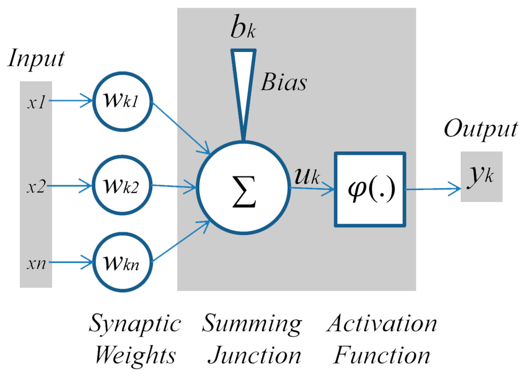 Where x1, …, xn are the input signals, wk1, …, wkn are the synaptic weights of neuron k, uk is the linear combiner output due to the input signals, bk is the bias, φ(.) is the activation function, and yk is the output signal of the neuron.