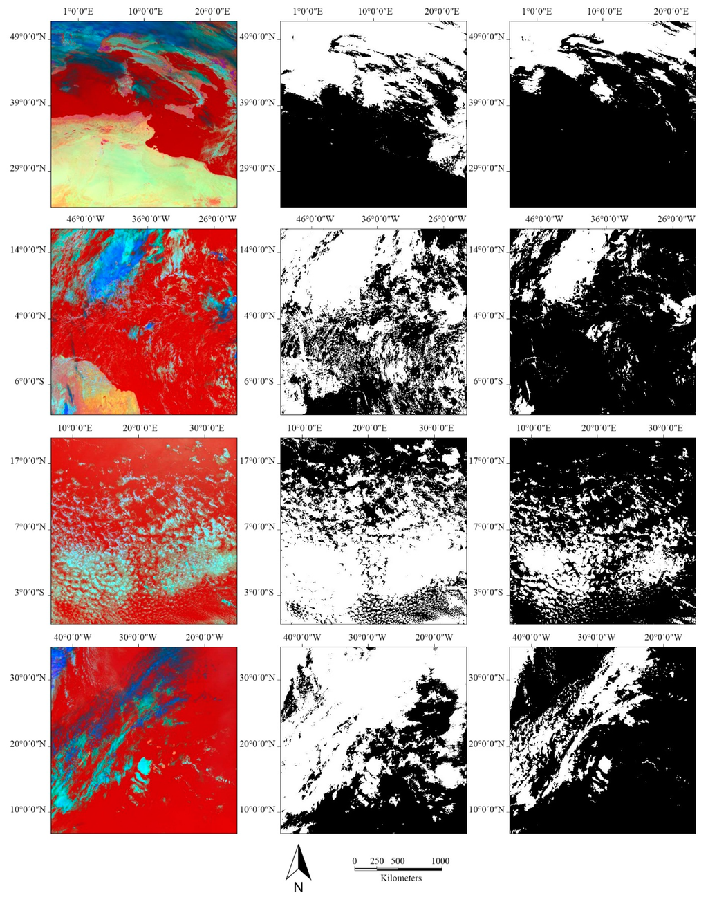 First column shows the band combination result R = 10.8 μm, G = 1.6 μm, B = 0.6 μm of Meteosat second generation SEVIRI images over Europe, multiple-layer perceptron neural networks classifier result (second column) and cloud mask products by EUMETSAT’s meteorological product extraction facility (third column). In this figure black color represents cloud free pixels and white color represents cloudy pixels.
