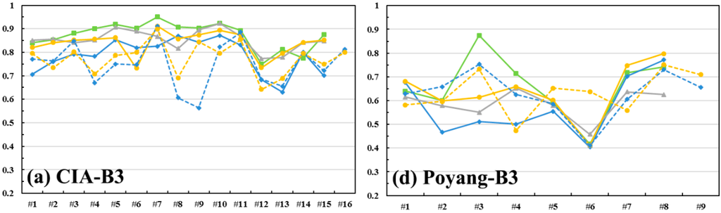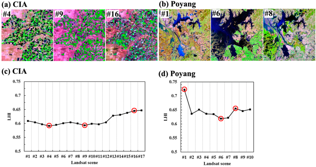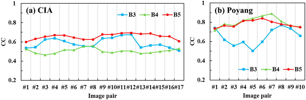 Dates of the acquired L-M pairs for the Poyang Lake and CIA sites are given in Table 2. For Poyang Lake, less cloud-cover MODIS data on the closest dates were substituted when uncontaminated MODIS images were unavailable on the targeted dates. For the CIA site, the acquired L-M pair dates were well correlated.