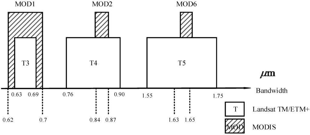 The quantity of remotely sensed data acquired from satellite instruments has greatly increased, contributing to multi-source and multi-resolution image sequences at regional or global scales. However, given the tradeoff between spatial resolution and temporal revisiting cycles [1,2], there is so far no single satellite sensor that can produce images with both fine spatial and temporal resolutions. A comparison of existing sensors and their spatial and temporal resolutions is given in Table 1. For example, SPOT series and Landsat TM/ETM+ multispectral data with spatial resolutions from 6 to 30 m have proven useful in monitoring forest and ecosystem dynamics [3,4,5,6,7], land cover classifications [8,9], and land cover/use change detection [10,11]. However, long revisit frequencies (16 days for Landsat series and 26 days for SPOT), frequent cloud contamination [12], complex topographic effects, and equipment failure make it difficult to acquire sequenced remotely sensed data that target the same region, and have prevented us from applying it to rapid monitoring of disturbance and change detection [2]. In contrast, the NOAA Advanced Very High Resolution Radiometer (AVHRR), SPOT-Vegetation (SOPT-VGT), and Moderate Resolution Imaging Spectroradiometer (MODIS) provide global multispectral imagery of land surface at 1–2-day revisit frequencies [13]. However, their relatively low spatial resolutions, from 250 m to 1 km, are not sufficient for quantitative monitoring of landscape changes that occur at sub-pixel resolutions. A possible cost-effective approach is to generate synthetic data with both fine spatial resolution and temporal frequency by blending the multi-sensor spatial and temporal characteristics. It has aroused great interest within the remote sensing community [2,14,15,16].