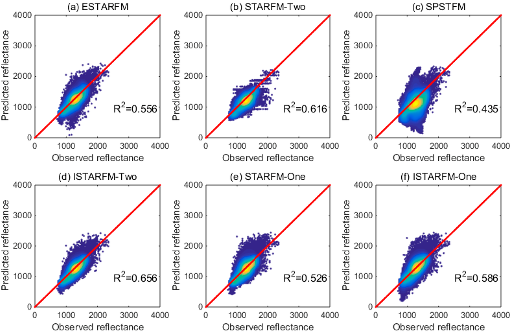 Many advances have been made in the past decade in both algorithm development and practical application of spatiotemporal fusion. However, there have been limited studies making unified comparisons of the existing spatiotemporal fusion models. The commonly used statistical scores, such as the correlation coefficient (CC), root-mean-square error (RMSE), average absolute difference (AAD), and Quality Index [37], are affected and constrained by selection of the individual study site. If a study site has not been observed concurrently in the input Landsat-MODIS (L-M) image pairs, unresolved spatiotemporal variances will cause biases in the predictions. Emelyanova et al. [38] performed a definitive assessment of the prediction performance of STARFM and ESTARFM against spatial and temporal variances. Jarihani et al. [39] evaluated the accuracy of STARFM and ESTARFM through testing two “Index-then-Blend” and “Blend-then-Index” approaches, and provided an assessment of the order for data blending and index calculation. Landscape heterogeneity also influences the prediction performance. Although ESTARFM aims to predict surface reflectance accurately in heterogeneous regions, it has not yielded a standard criteria for landscape heterogeneity [40]. However, there is no unified comparison work that has been made. This research will compare existing spatiotemporal fusion models based on the performance of spatiotemporal comparability, landscape heterogeneity, and model parameter selection.