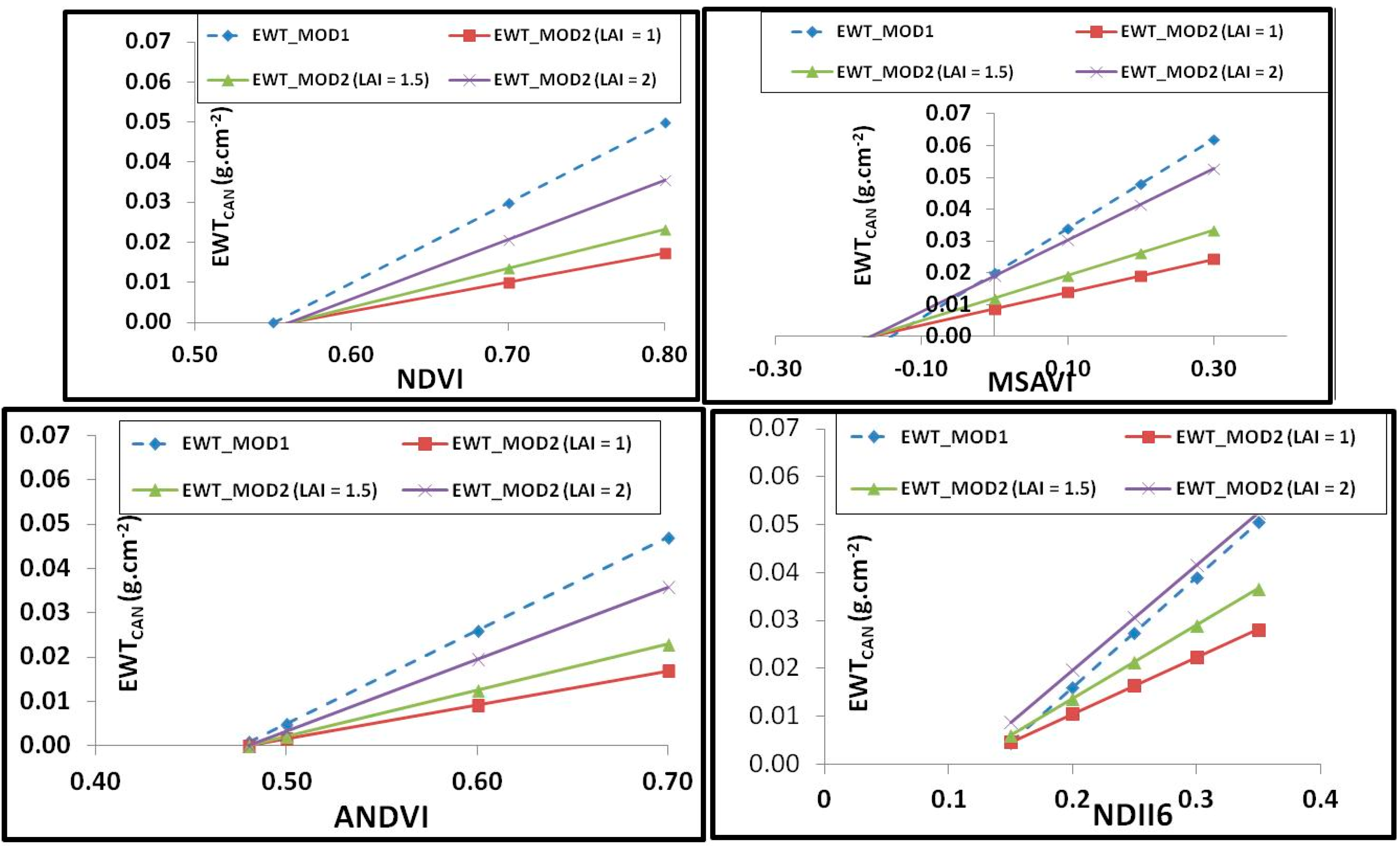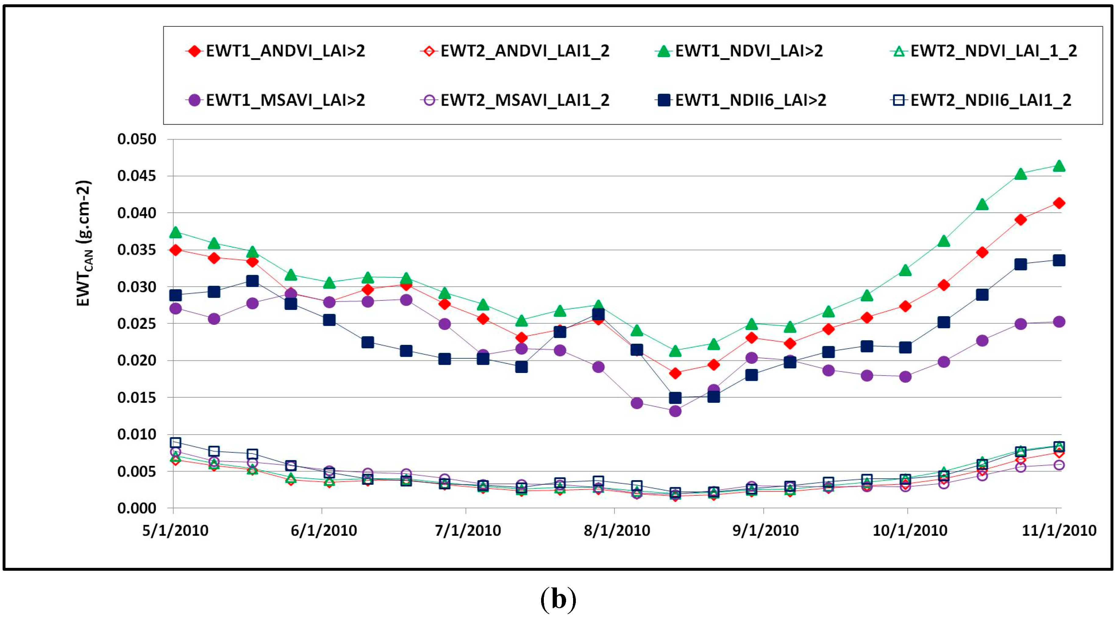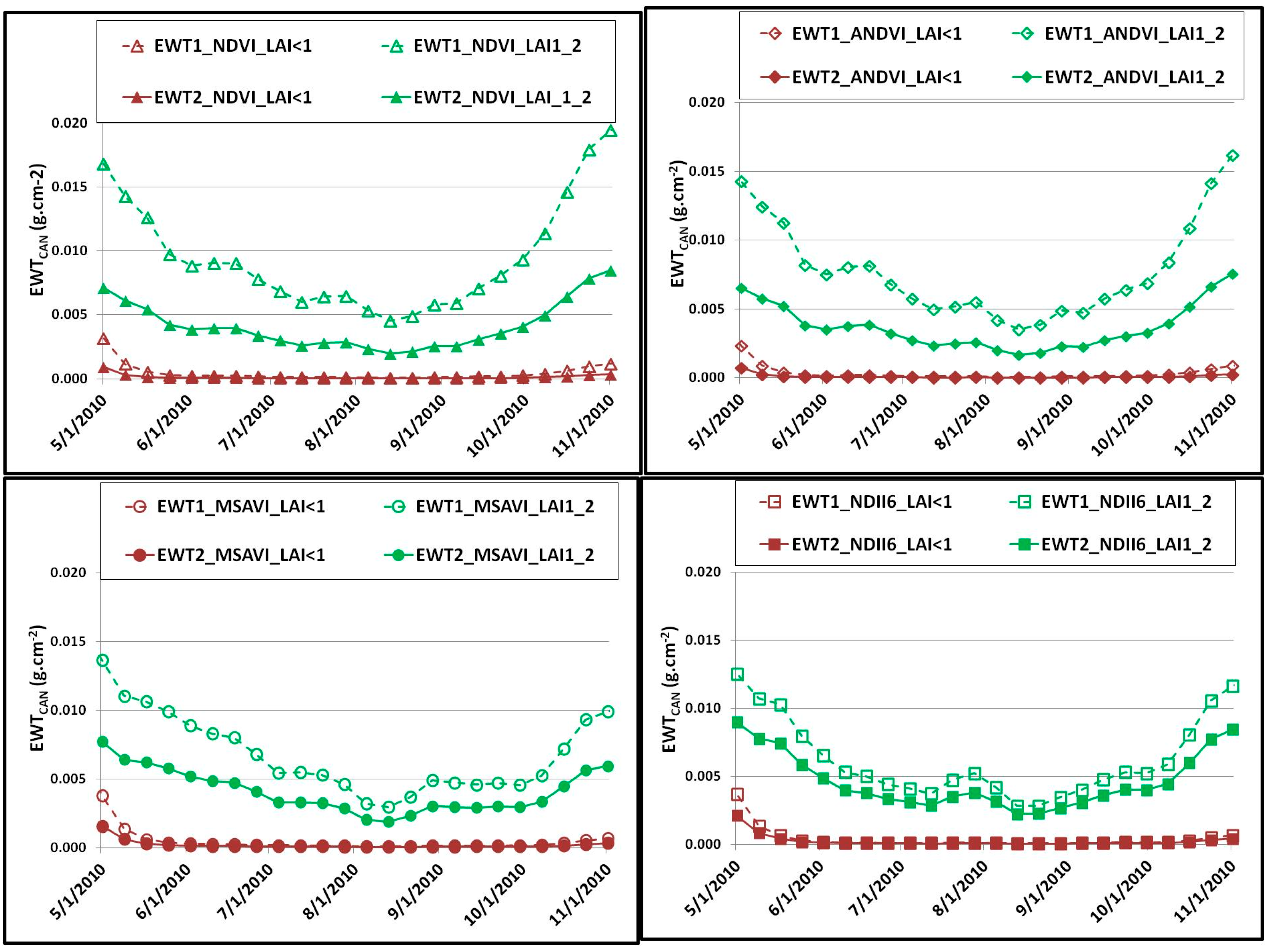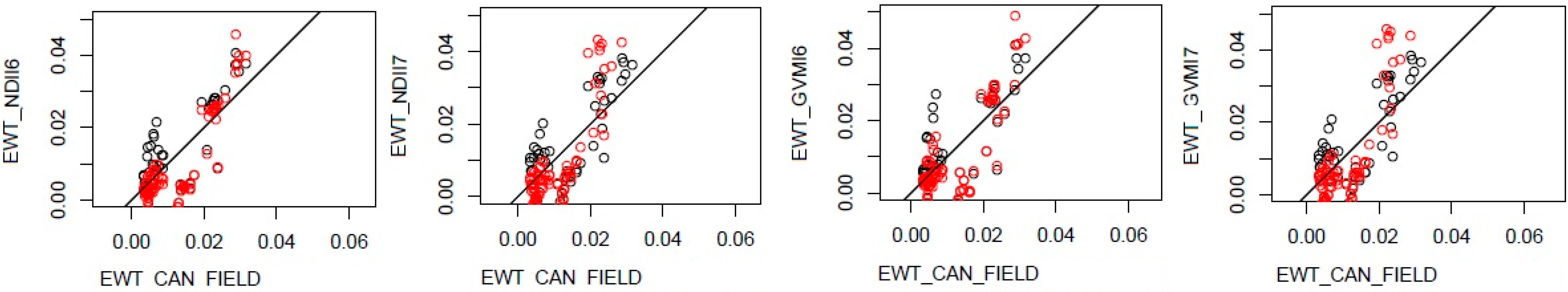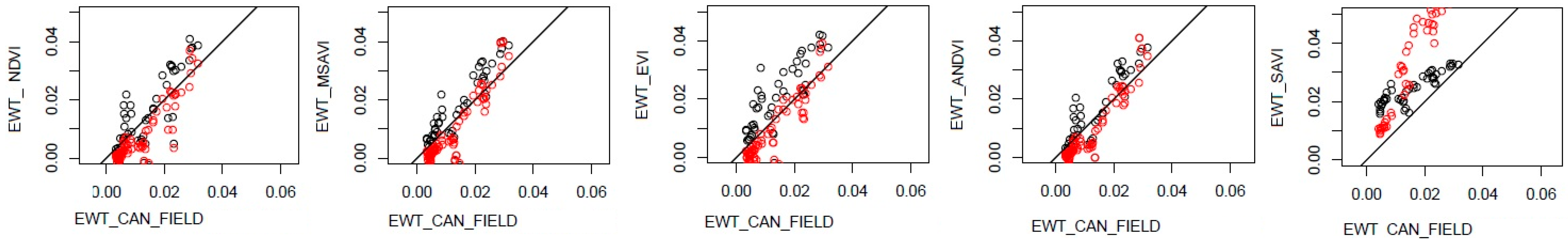 3.1. Spatial and Temporal Relationship between EWTCAN and Remotely Sensed vegetation indexes (VI)