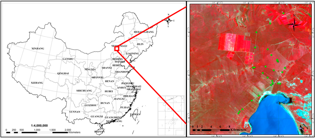 The selected test sites are situated in the Gongger prairie, which is located northwest of Chifeng in the northern central region of Inner Mongolia, China (43°26′N, 116°40′E; altitude 1236 m) (Figure 1). This area is the remote sensing test site for in-orbit calibration and authenticity tests, and it was established in 2006 by the Institute of Remote Sensing and Digital Earth, Chinese Academy of Sciences [17]. Its main landscape type is typical steppe that is composed mostly of Stipa krylovii Roshev, Stipa grandis, Leymus chinensis, Agropyron cristatum, and Artemisia frigida Willd. The climate is continental monsoon with an average annual temperature of 1 °C and average annual precipitation of 395.8 mm.