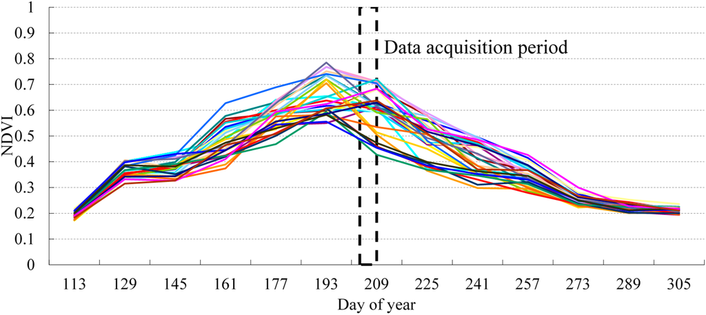 Based on the results of the NDVI derived from HJ-1 CCD image data within 10 days prior to the monitoring and field investigations, 62 grassland plots (30 × 30 m) with different vegetation coverages were chosen. Seven quadrats (1 × 1 m) along the diagonal direction of each sample plot were then used for field measurements. The field measurements comprising grass hyperspectral reflectance, LAI, and vegetation coverage were performed from 31 July to 6 August 2013, and a MobileMapper™ CX GPS was used to record the GPS coordinates of the sampling points. From the perspective of vegetation phenology, the field measurement data recorded the most vigorous growth stage of the grassland in the research area, as illustrated by the time-series curves of 16-day composite MODIS (Moderate Resolution Imaging Spectroradiometer) 250-m NDVI of different sample plots in the 2013 growing season (Figure 2) [18].