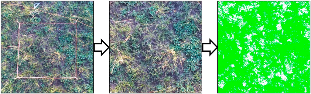 Grass coverage measurements were undertaken synchronously with the hyperspectral reflectance field measurements. A digital camera was placed above the grass canopy at a height suitable to frame the surface quadrat. All the photographs were clipped by the boundary of the quadrat frame and the vegetation coverage was derived by image classification (Figure 3).