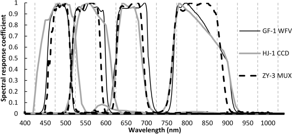 Spectral response functions for GF-1 WFV, HJ-1 CCD, and ZY-3 MUX.