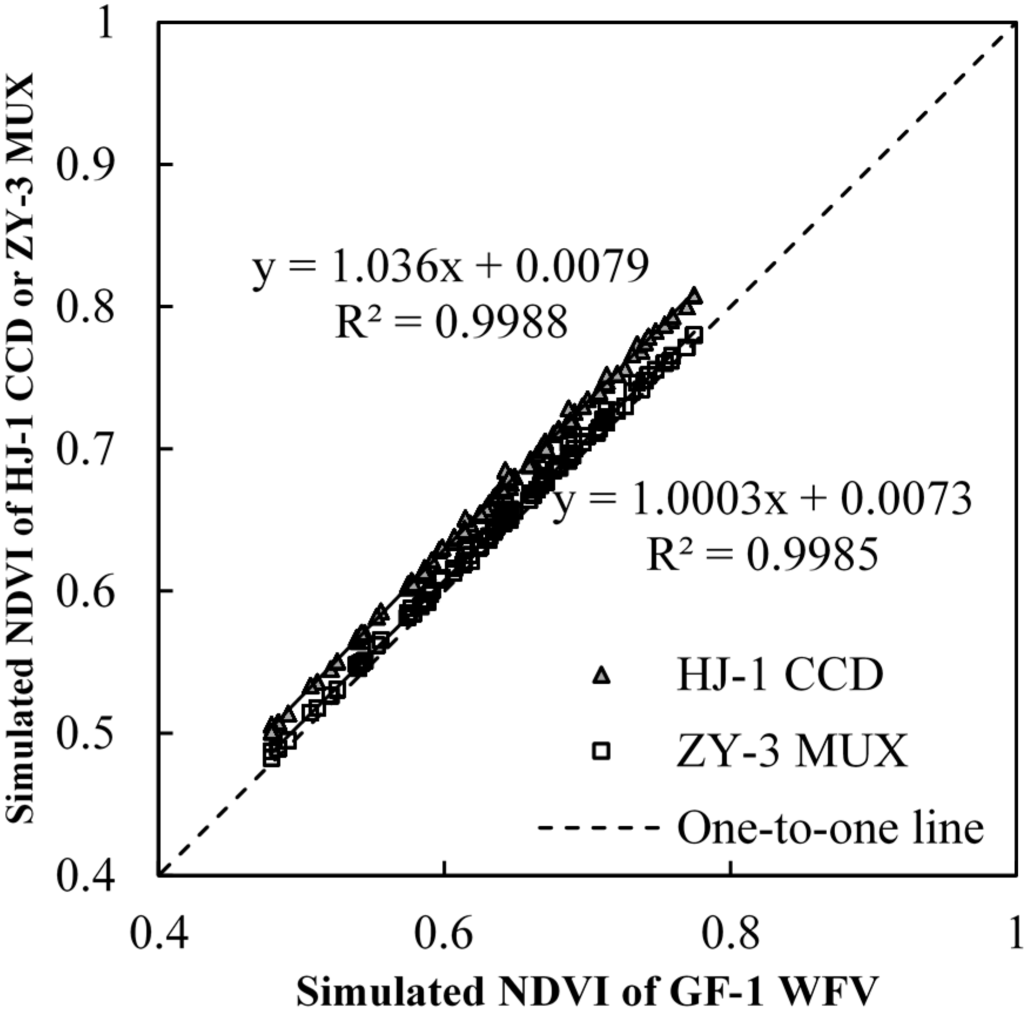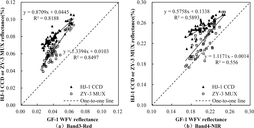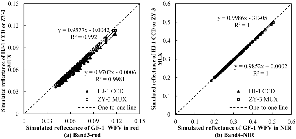 In order to assess the effects of varying spectral response functions in the red and near-infrared bands for the different sensors, Equation (1) was used to calculate the band reflectance based on the measured canopy hyperspectral reflectance. Then, a correlation analysis method was used to investigate the contrasts between the different sensors. The results of correlations between GF-1 WFV with ZY-3 MUX or HJ-1 CCD are presented in Figure 8. The adjusted determination coefficients (R2) for the red band are 0.9981 and 0.992, respectively, and all R2 values for the near infrared band are 1.0. All of the R2 values given in Table 5 are a little higher than those of IKONOS and ETM+ or SPOT presented in Soudani et al. [10]. These results show that the spectral response function has some influence on the band reflectance, but that the overall effect is small.