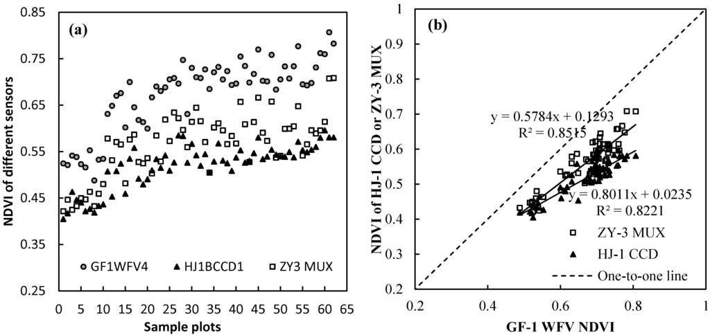 We evaluated the consistency and correlation of GF-1 WFV, HJ-1 CCD, and ZY-3 MUX sensor data for grassland monitoring applications by comparing spectral field measurements, vegetation coverage, and the leaf area index (LAI) of grassland stands with reflectance in the red and near-infrared bands and the Normalized Difference Vegetation Index (NDVI). The R2 values in the infrared band (0.556–0.893) and red band (0.819–0.850) showed that the correlation between sensors was higher for the red band than the infrared band. The correlation of NDVIs derived from the different sensor types was high (R2 between 0.758 and 0.852); however, the consistency was low in that the NDVI based on GF-1 WFV data was significantly higher than that based on ZY-3 MUX and HJ-1 CCD data.