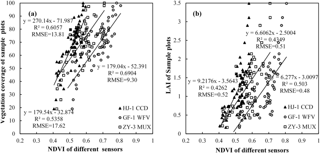 The phenology is an important characteristic of grassland vegetation during different periods [18]. However, in our study, the data from the three sensors were obtained by adjusting the satellites observation tasks, which has certain inherent difficulties for measurements at many periods during the year. Correlation analysis between ground grass-coverage and measured LAI data shows that the GF-1 WFV sensor gave the best performance, but its’ value is higher than those of the other two sensors, and the reason for this will require a more in-depth study to explain.