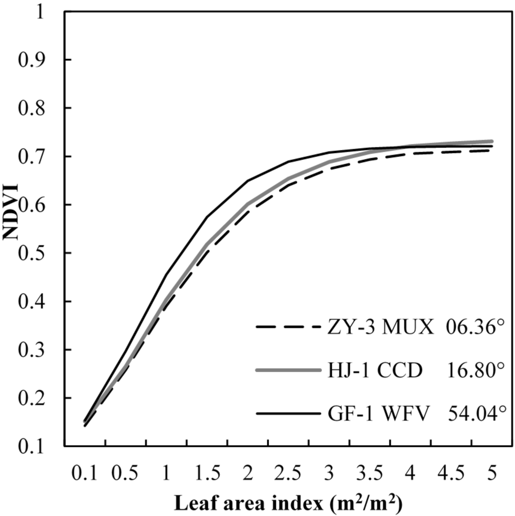 In order to compare further the characteristics of the NDVI from the different sensors, we used the PROSAIL radiative transfer model to simulate grass canopy reflectance with different satellite angles (θZY-3 = 6.36°, θHJ-1 = 16.80°, and θGF-1 = 54.04°) for LAI values of 0–5. Equation (1) was used to calculate the reflectance of the red and near-infrared bands based on the simulated grass canopy hyperspectral reflectance. This was then input into Equation (2) to obtain the NDVI. The results within the range of zenith angles relevant to this study are shown in Figure 10. It can be seen that the vegetation NDVI increases with increasing LAI, and that the range of increase varies depending on the LAI range. For LAI values ranging from 0 to 3, NDVI changes significantly with increasing LAI, and the differences between GF-1 WFV, ZY-3 MUX, and HJ-1 CCD values are caused by satellite zenith angle differences. For LAI values ranging from 0.5 to 1, the effect of the sensor zenith angle increases with increasing LAI; when LAI = 0.5, the GF-1 WFV NDVI is 11.9% and 14.89% greater than for ZY-3 MUX and HJ-1 CCD, respectively, but when LAI = 1, the GF-1 WFV NDVI is 12.85% and 16.60% greater than for ZY-3 MUX and HJ-1 CCD, respectively. For LAI values ranging from 1.5 to 3, the effect of the sensor zenith angle decreases with increasing LAI, when LAI = 1.5, the GF-1 WFV NDVI is 10.93% and 14.67% greater than for ZY-3 MUX and HJ-1 CCD, respectively, but when LAI = 3, the GF-1 WFV NDVI is 2.82% and 5.04% greater than for ZY-3 MUX and HJ-1 CCD, respectively. When LAI > 3.5, the NDVI values represent a saturated tendency, and the differences caused by the satellite angles are clearly reduced.