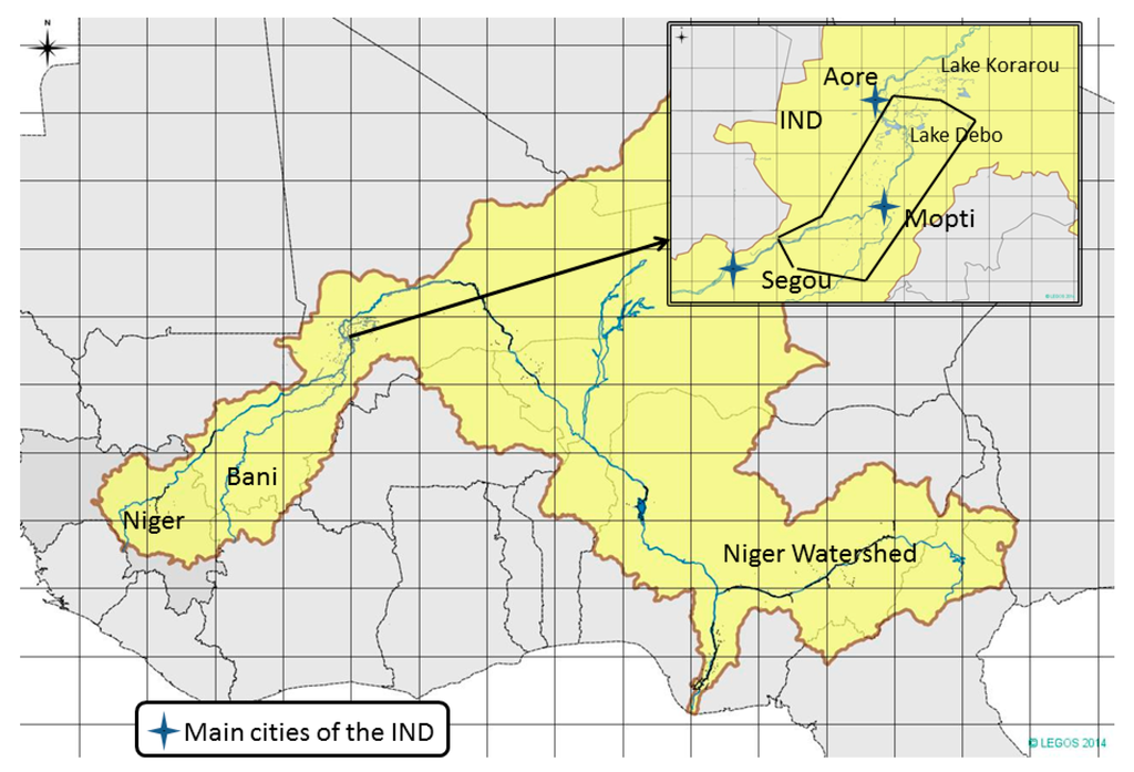 The IND is a vast floodplain of 73,000 km2 located in the arid (north part of the delta: 15,000 km2) and semi-arid (south part of the delta: 58,000 km2) Sahelian zone (Figure 1). It is composed of large numbers of swamps, river channels, permanent lakes and non-permanent flooded areas. The IND is seasonally inundated (from September to November) due to rainfall over the Niger and Bani Rivers’ upstream areas (From June to September). This produces (when cumulated) an average annual discharge at the delta’s entries of 1490 m3 s−1 (period 1955–1996), which represents 47 km3.yr−1 [3]. Inundations in the southern part are characterized by a regular and rapid flow of water while in the northern part the water stays longer [3]. The evaporation rate over the IND varies both spatially and temporally: it is higher in the northern part (700 mm/year on average) than in the southern part (140 mm/year on average), and depending on the year can vary from 400 to 1300 mm/year [3]. Inundations over the IND are marked by very high inter-annual and long-term variability, which is linked to the amount of rainfall in the upstream rivers’ watersheds. Li et al. [4] highlighted large inter-decadal variations of rainfall over the last 50 years, with the wettest decade (1950–1960) and the driest (1970–1980) being due to climate variability over the Atlantic Ocean. Based on a hydrological water balance model, Mahé et al. [3] calculated that the flooded extent over the IND varied from dry to wet years by a factor of 5; from 40,000 km2 in 1955 to 9000 km2 in 1984.
