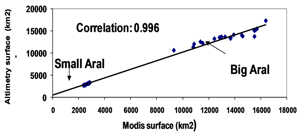 Validation was performed over the Aral Sea in Central Asia using previous results obtained in [38,39]. Variations in height, surface and volume of the Aral Sea were calculated for 1992 to 2005, with a combination of altimetry data from Topex/Poseidon and Jason satellites, and a digitized bathymetry map of the lake’s basin. We extended this calculation until 2007 for this study. Using a selection of 55 MODIS images over the period from 2000 to 2007, we calculated the surface variations of Small and Large Aral and compared with the results obtained by altimetry and bathymetry. The results are shown in Figure 2. The agreement between both methods of surface variation calculations is marked with a correlation coefficient of 0.996 and RMS differences of detected water extents less than 2%.