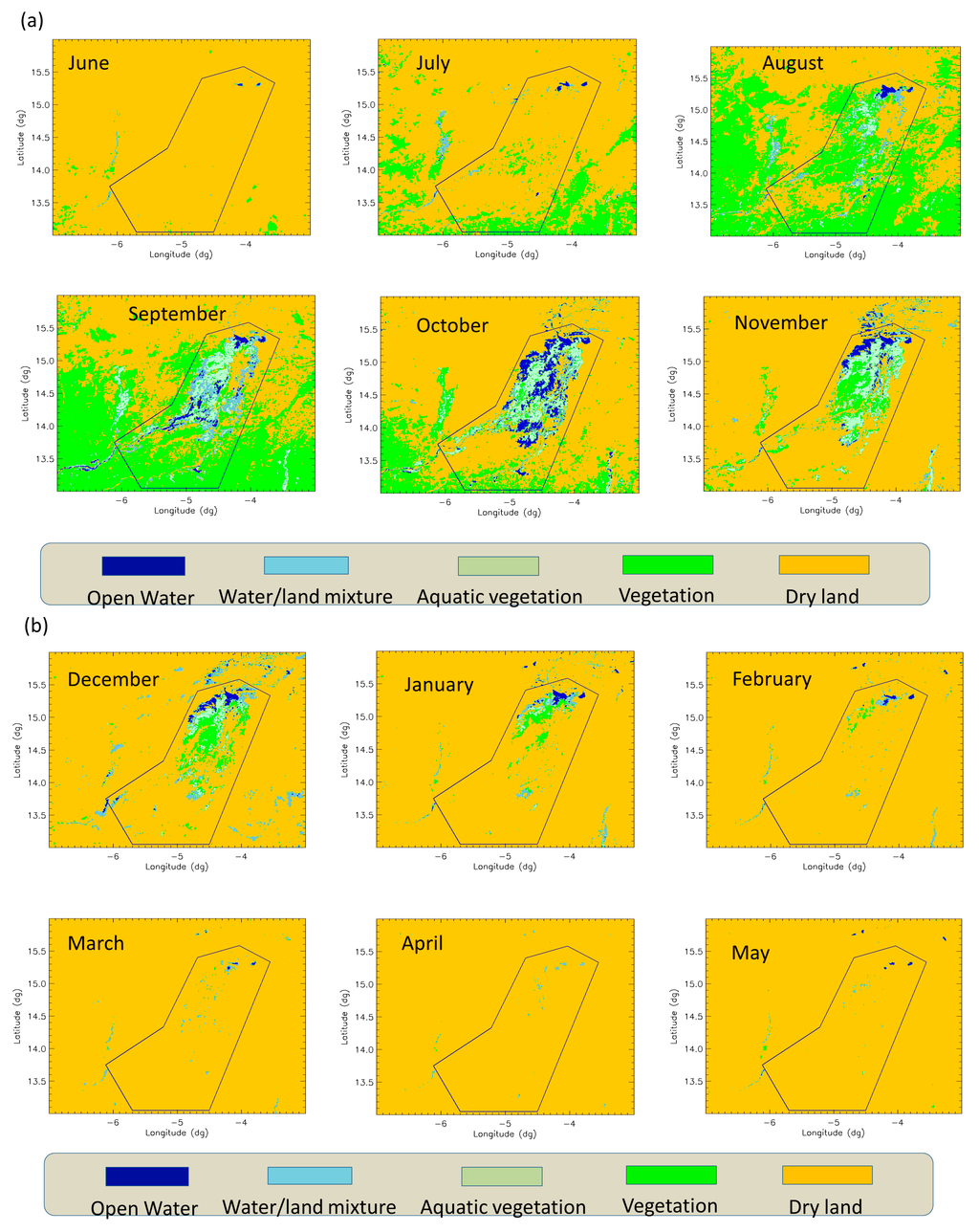 Moderate Resolution Imaging Spectroradiometer classification of the Inner Niger Delta (IND) with one image per month in 2003–2004 being selected for illustration of the inundation phenomenon over the Inner Niger Delta (IND) (a) from June to November 2003, (b) from December 2003 to May 2004.