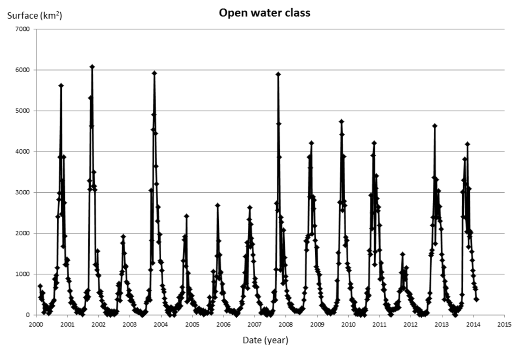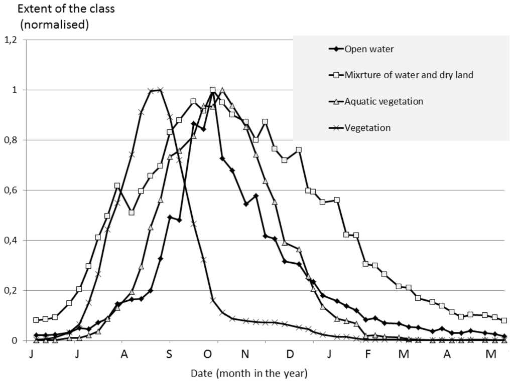 This inundation sequence is also illustrated in Figure 4. It represents (over the 14 years of this study) an average surface extent of different classes detected by MODIS over the ROI. In order to be comparable, these average surfaces were normalized. This figure shows that the peak of vegetation occurs at the beginning of September, whereas the peak for open water, mixture of water and dry land and aquatic vegetation appears one and a half months later.