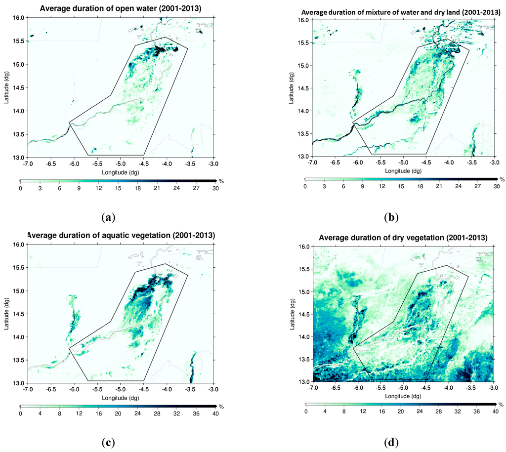 Figure 5a shows that flow duration in the southern part of the delta is rather short (less than a month) and very heterogeneously distributed. The “NW belt” of long duration (more than two months) is highlighted in dark blue. Due to the images’ spatial resolution both the Niger and Bani rivers do not appear as permanently covered with water. These can be better viewed in Figure 5b, which shows the duration of mixed water (pixel covered both with water and dry land). This is confirmation that the southern part of the delta is a zone of rapid water flow and that the northern part behaves as a pool where water stays longer [3]. A much larger surface is covered with aquatic vegetation and mixture of water and dry land for periods exceeding one month (Figure 5b,c). Over the IND aquatic vegetation duration is also noticeably longer on the left bank of the Niger River than on its right bank where the Bani River is located. Along the NW belt mentioned above, aquatic vegetation duration often exceeds three months (Figure 5c). Dry vegetation (Figure 5d) is present almost everywhere over the IND for long period of time (more than three months) and up to three to four months on the delta’s west bank.