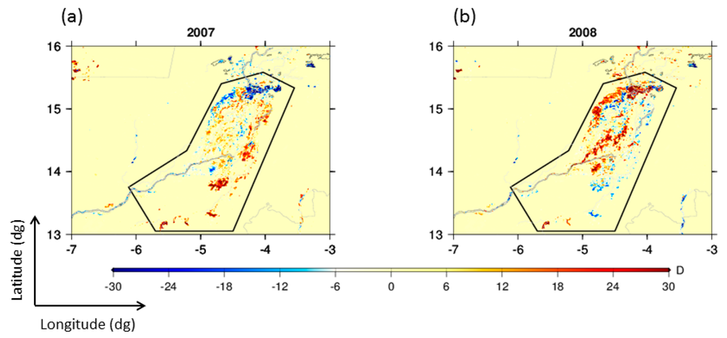 In another recent study, it has been simulated from Global Climate Models (GCMs) that rainfall over the Bani River catchment area will likely decrease until the end of the 21st century by about 15% to 17%. Consequently, there will be a large reduction in river discharge into the IND [6]. Moreover, inundations in the IND influence local rainfall through vertical energy flux and water vapor from the land to the atmosphere [7]. They observed a resurgence of daytime cloud cover during inundations. This was in response to evaporation over the IND, which in turn increased the likeliness of storms in the mid-afternoon, mainly on the western border of the IND.
