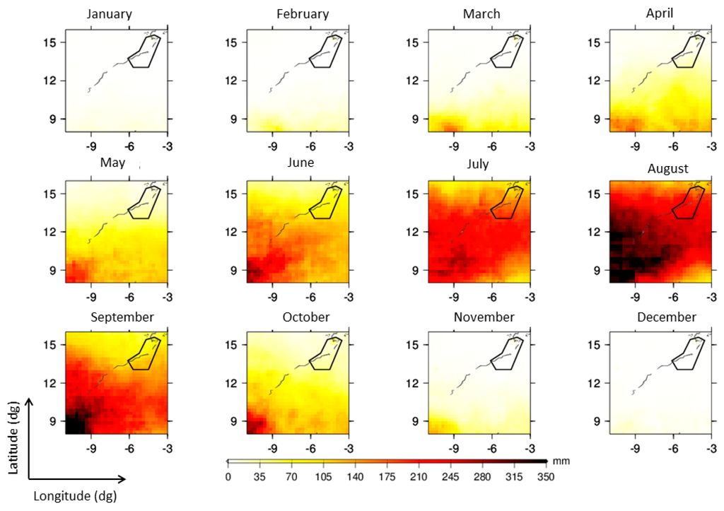 Using the precipitation data sets, we then calculated a so-called-seasonal “climatology”: a monthly map of average rainfall deduced from the full period of observation (Figure 11). Firstly, the period from November to April marks the dry season with zero precipitation over both rivers. Over the IND, the dry season continues until June with very low rainfall: less than a few dozen mm in May. In May, more significant rainfall occurs over the source of the Niger and Bani rivers. But the start of the wet season in June is when strong precipitation over the Atlantic coast of West Africa moves northeastward. Meanwhile, it starts to rain over the IND itself, with increasing precipitation in July and August. In August, precipitation is at its maximum over the entire region. It then starts to decrease from the IND to the southwest until November when it is totally dry everywhere (Figure 11).