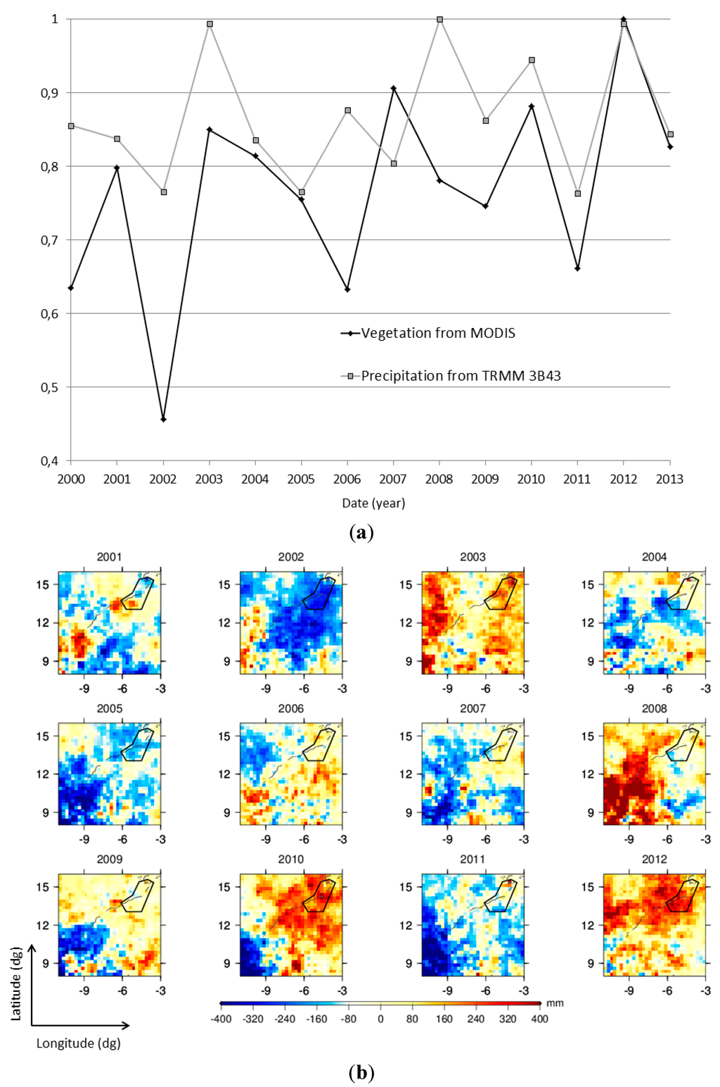 (a) Annual normalized precipitation over the Region Of Interest (ROI) from Tropical Rainfall Measuring Mission 3B43 compared to annual normalized coverage area of vegetation over the Inner Niger Delta (IND) measured by Moderate Resolution Imaging Spectroradiometer; (b) annual rainfall anomalies with respect to the global mean.