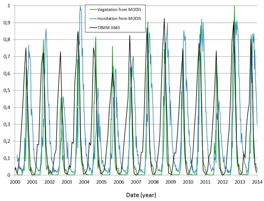 From MODIS data we also calculated the total surface using the three classes that include water: open water, mixture of water and dry land, and aquatic vegetation. The time series is given in Figure 13 where the total inundated surface calculated every eight days is compared to monthly rainfall. The data was normalized in order to make a comparison. The first conclusion to be drawn from this figure concerns the time shift between maximum rainfall over the Niger and Bani river basins and the maximum flood over the IND. We found one and a half months with a standard deviation of eight days. It tends to confirm that inundations are due to rainfall in the upstream river areas located a few hundred kilometers away from the IND. If we calculate the correlation between annual rainfall and maximum inundation over the IND, we obtain 0.65. No decadal trend was observed from this analysis showing that for inundations (total of the three “water” classes), the inter-annual variability dominates the long-term trend.