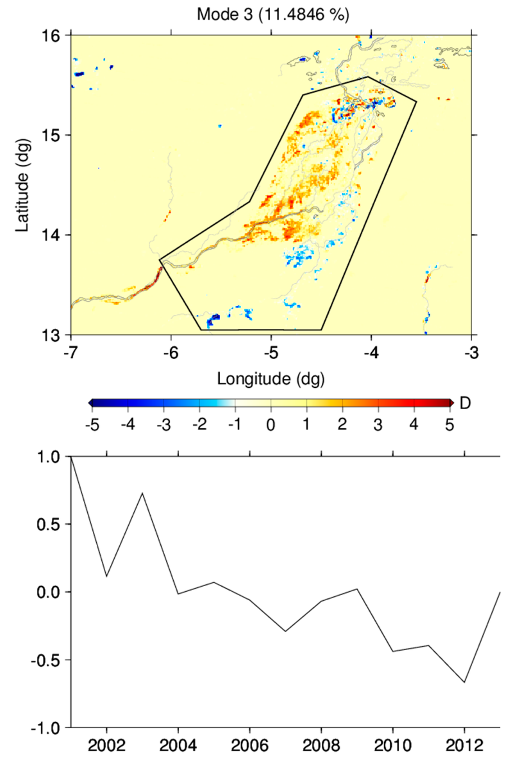 Figure 16 shows the third mode of the open water class over the IND representing 11% of signal variance, and we can observe a dipole between the part of the delta fed by the Niger River and the part of the delta fed by the Bani River. This indicates a slight decrease of several days per year in inundation in the west part of the IND and an increase in the eastern part. The decrease in precipitation over the Niger River observed by mode 1 of rainfall (Figure 15a without any signal over the Bani River) and combined with an increase in precipitation over the Bani (which can be observed from mode 2 of rainfall (Figure 15b)) may explain this dichotomy between western and eastern parts of the delta. The spatial repartition of the signal from mode 2 also includes a part of the Niger River but in the region near the delta. This region has lower rainfall than over the upstream area and therefore does not compensate the general decrease, as observed by mode 1 in the upstream part of Niger River.