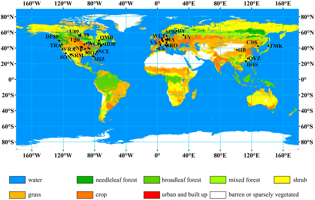 | ARM_SGP_Main (ASM) | USA | 36.61 | −97.49 | CROP | 2003 | 2004 | Fischer et al. (2007) [43] |