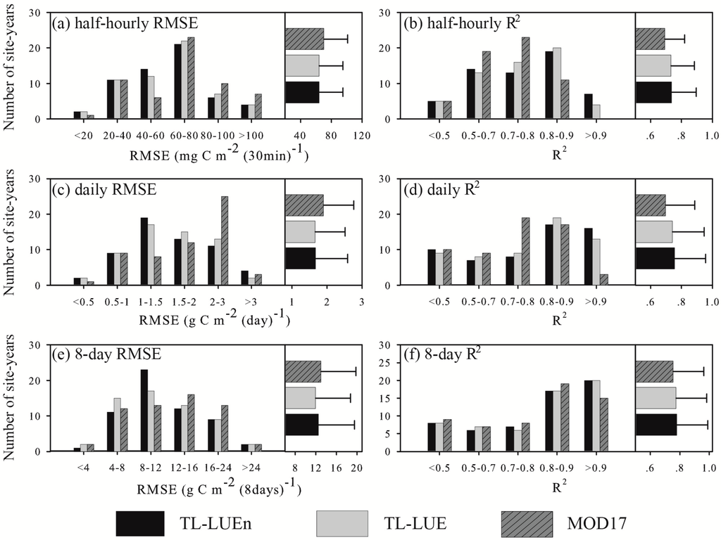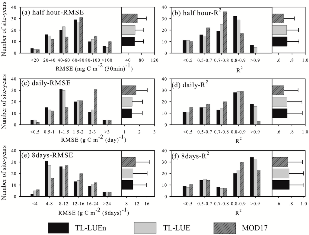 In this study, the ability of nonlinear two-leaf LUE, linear two-leaf LUE, and MOD17 to simulate GPP at half-hourly, daily, and 8-day temporal scales were verified using GPP derived from net ecosystem productivity (NEP) measured at globally distributed 58 sites as benchmarks. The main goals of this study are: (1) to compare the performance of the MOD17, linear and nonlinear two-leaf LUE models at three different temporal scales (half-hourly, daily and 8-day); (2) to analyze the possible causes for the different performances of three LUE models. For simplicity, the MOD17, linear two-leaf LUE, and nonlinear two-leaf LUE models will be referred to hereinafter as MOD17, TL-LUE, and TL-LUEn, respectively.