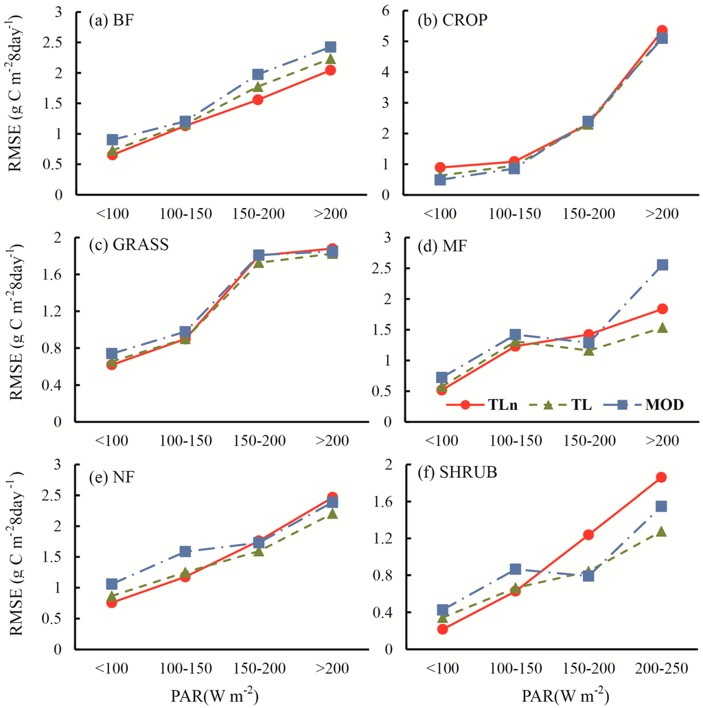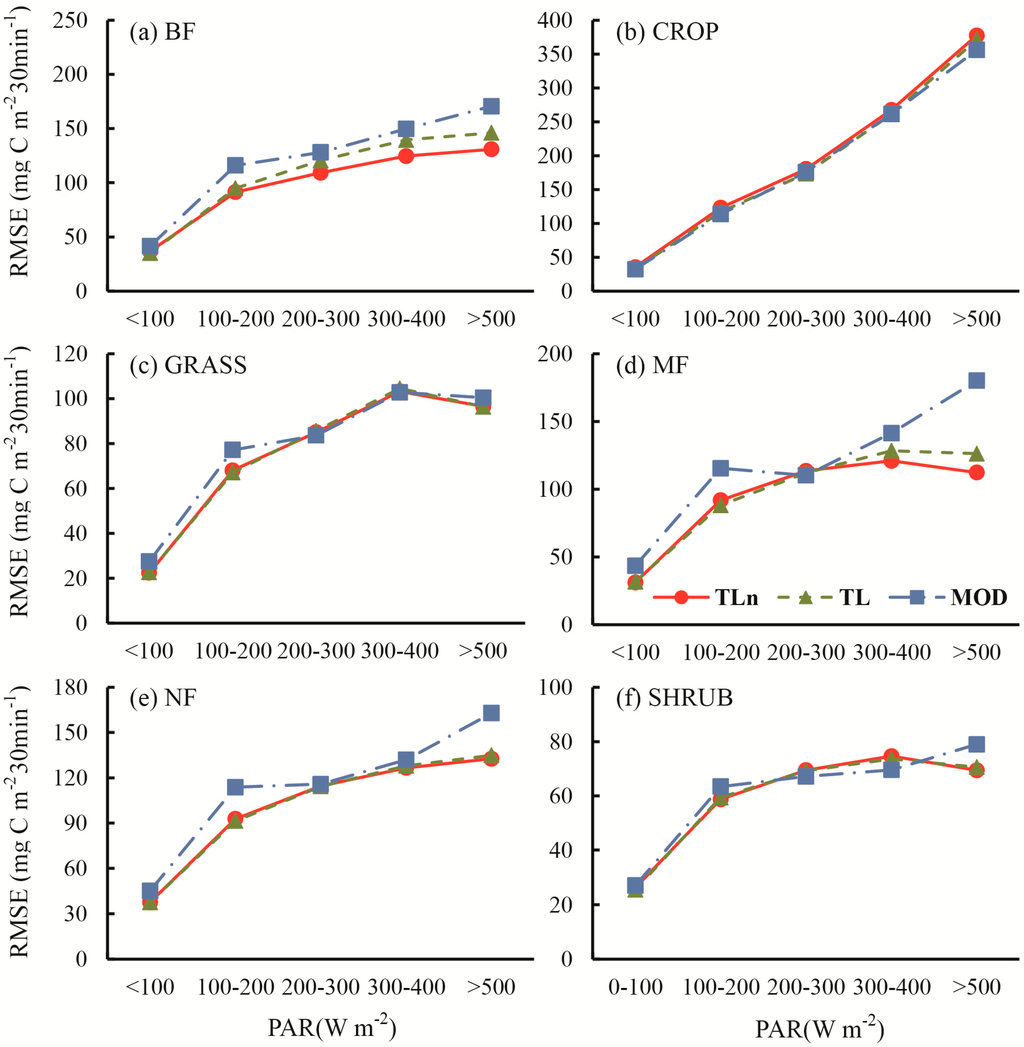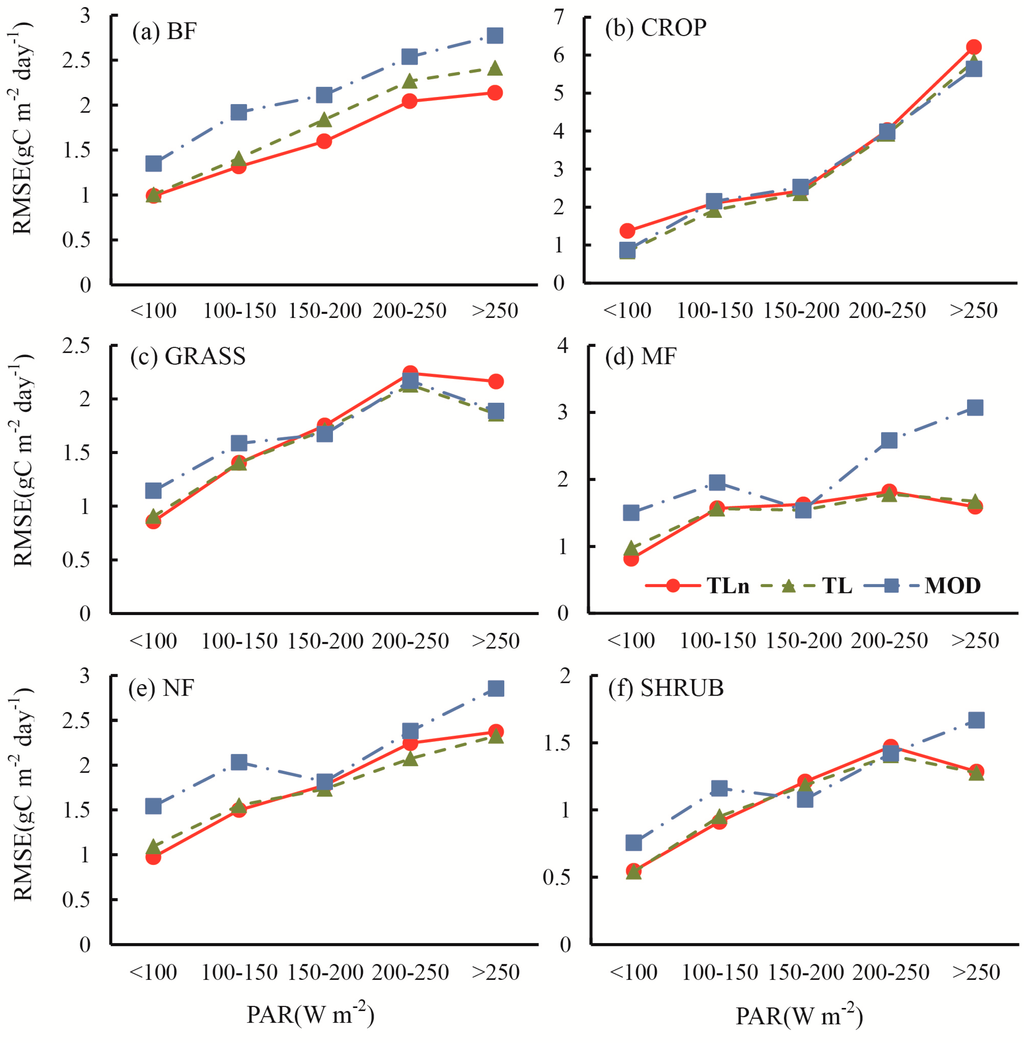Previously, linear LUE models have been mostly used to calculate GPP at daily, 8-day, and even longer temporal scales [7,8,9,10,32,33]. Recently, this type of models is used to calculate GPP at short temporal scales. For example, Carbon Tracker, a system to optimize terrestrial carbon flux, uses the Carnegie-Ames Stanford Approach (CASA) biogeochemical model to calculate GPP every three hours as the prior carbon flux [34]. Such application of linear LUE models might induce biases in simulated GPP since observations have indicated the nonlinear response of canopy GPP to incoming PAR at short temporal scales [15,27,28,29,30,31]. Therefore, the assessment of applicability of different types of LUE models in simulating GPP at different temporal scales is of great significance to improving the simulation of GPP using remote sensing data.