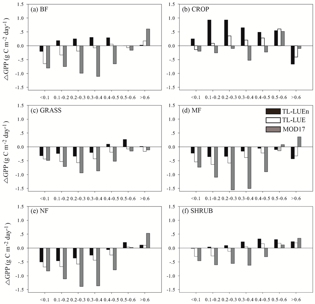 More and more process models now calculate photosynthesis for sunlit and shade leaves separately [24,25,26]. However, this strategy has not been adopted by LUE models. To remedy this limitation, He et al. [23] recently developed a two-leaf LUE model on the basis of the MOD17 model. This new model considered differences in radiation absorption and in LUE of sunlit and shaded leaves. Validation at 6 ChinaFLUX sites demonstrated the improvement of the two-leaf LUE models over the MOD17 model in simulating GPP, especially at forest sites, with a R2 value increasing about 0.1 and a root mean square error (RMSE) value decreasing about 0.64 g C m−2 day−1 on average.