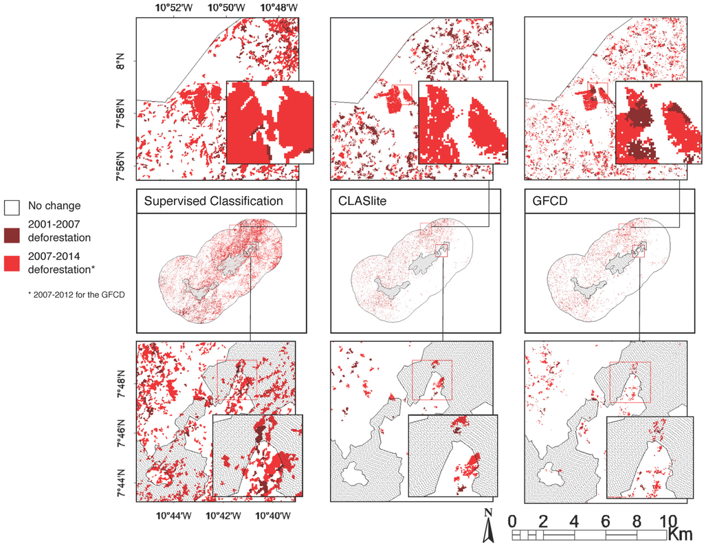 Forest cover-change maps of Gola and its surrounding 25 km region derived from three classification techniques and disaggregated into the time periods 2001–2007 (maroon) and 2007–2014 (red) (or 2007–2012, for the GFCD). The top row of zoomed-in panels depicts a palm plantation (the same region depicted in the top-row panels of Figure 1). The bottom row of zoomed-in panels depicts encroachment into Gola National Park. The interior region of Gola is stippled.