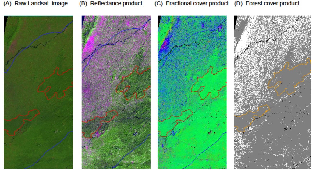 Intermediate products derived from each of CLASlite’s four built-in steps using the 2014 Landsat satellite image over the eastern portion of Gola as an example. (A) Band selection for representation of the raw Landsat image is R = Band 5 (0.85–0.88 μm), G = Band 4 (0.64–0.67 μm), and B = Band 3 (0.53–0.59 μm). (B) Band selection for representation of the reflectance product is the same as that for (A). (C) Band selection for representation of the fractional cover product is R = bare substrate, G = photosynthetic vegetation, B = non-photosynthetic vegetation. (D) In forest cover product, grey areas represent forested regions and white areas represent non-forested regions. The Gola National Park boundary is outlined in either red or orange, while the extent of the 25 km boundary surrounding Gola is depicted in blue.
