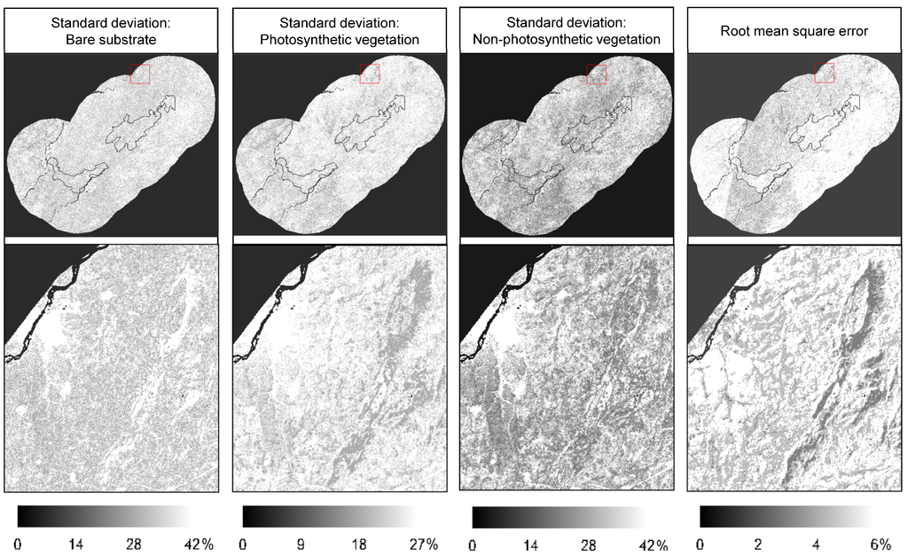 Uncertainty of the bare substrate (S), photosynthetic vegetation (PV), and non-photosynthetic vegetation (NPV) fractional cover outputs from CLASlite alongside total error (root mean square error) of CLASlite’s fractional cover output over the 25 km region surrounding Gola. Error images derive from the 2014 Landsat image over the eastern portion of Gola. Standard deviations of CLASlite’s AutoMCU iterations represent the uncertainties of the S, PV, and NPV outputs. The root mean square error of the modelled versus observed reflectance signatures expresses total map error. Zoomed-in areas of the regions enclosed by red squares in the top row of panels appear in the bottom row of panels and represent the same palm plantation depicted in the top row of Figure 1 and Figure 2. The Gola National Park boundary is outlined in black.