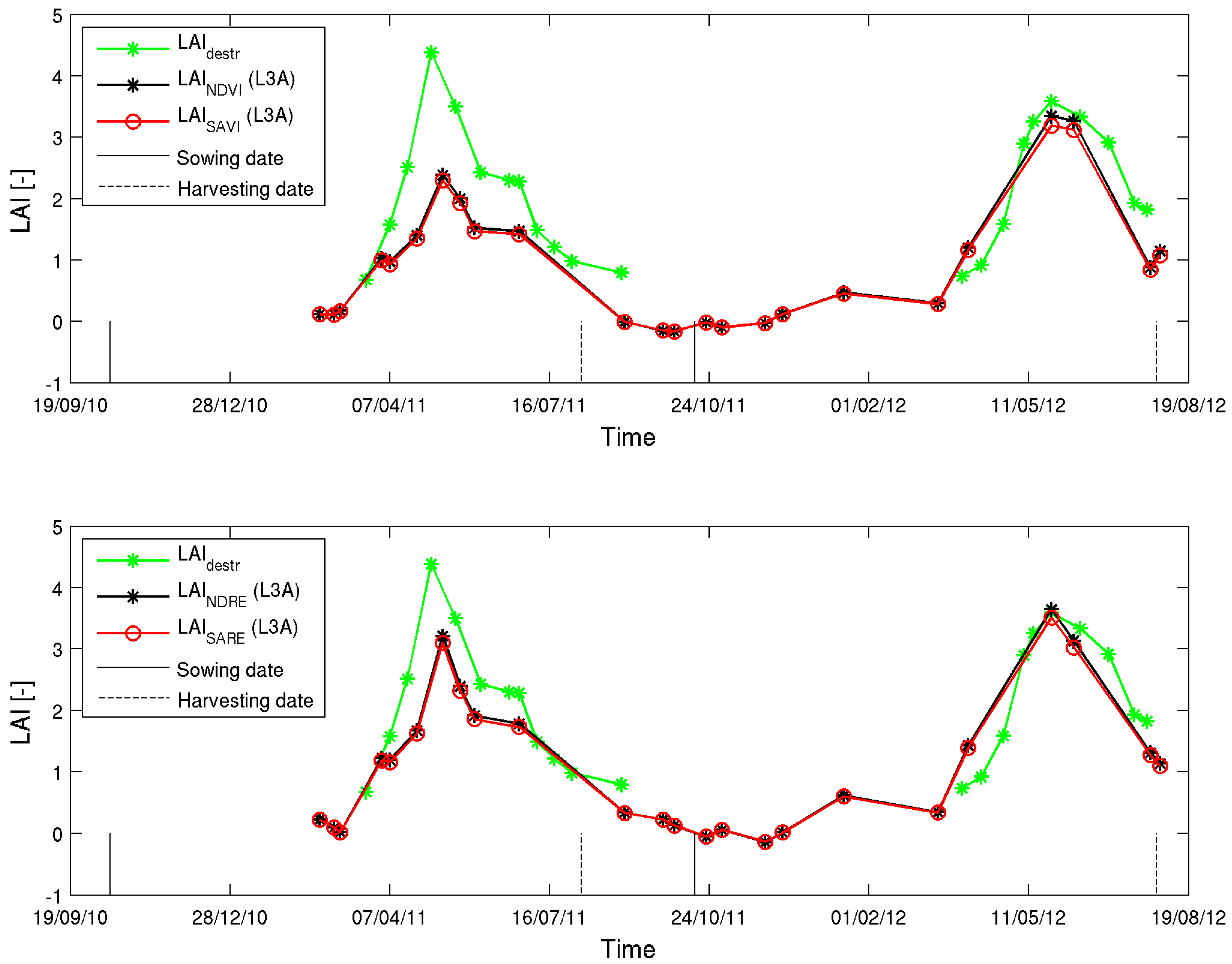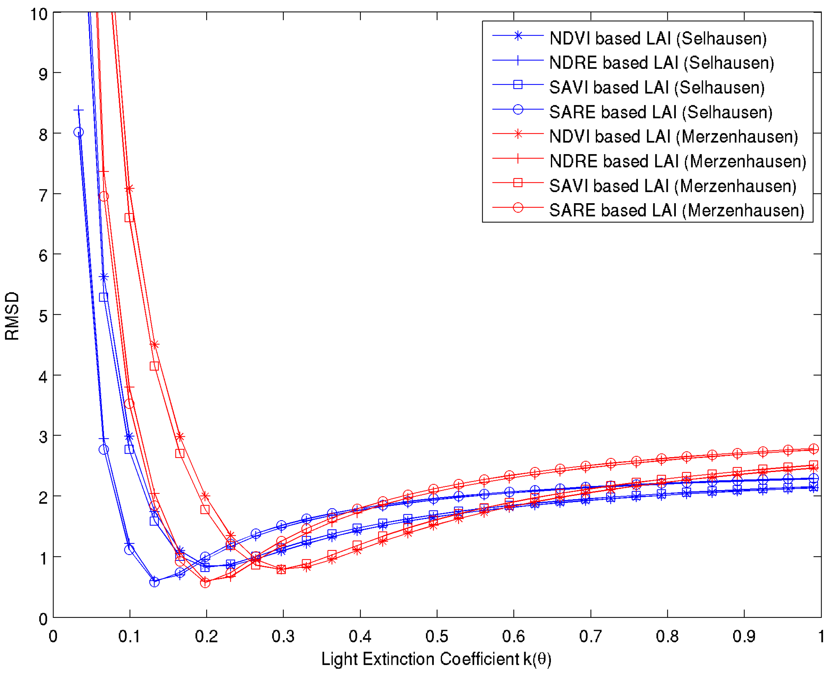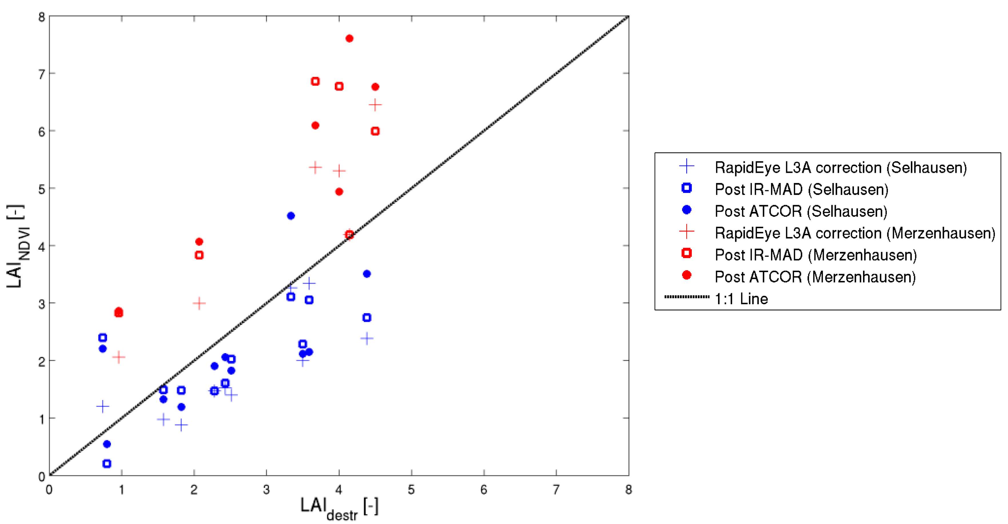 | LAIrapideye vs. LAIdestr for Winter Wheat | Selhausen (2011–2012) | Merzenhausen (2011) | ||||