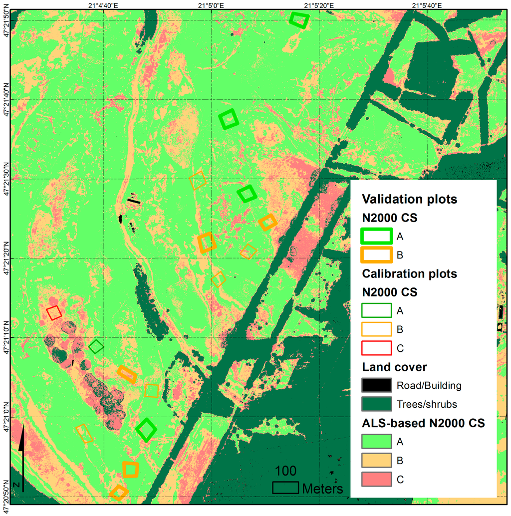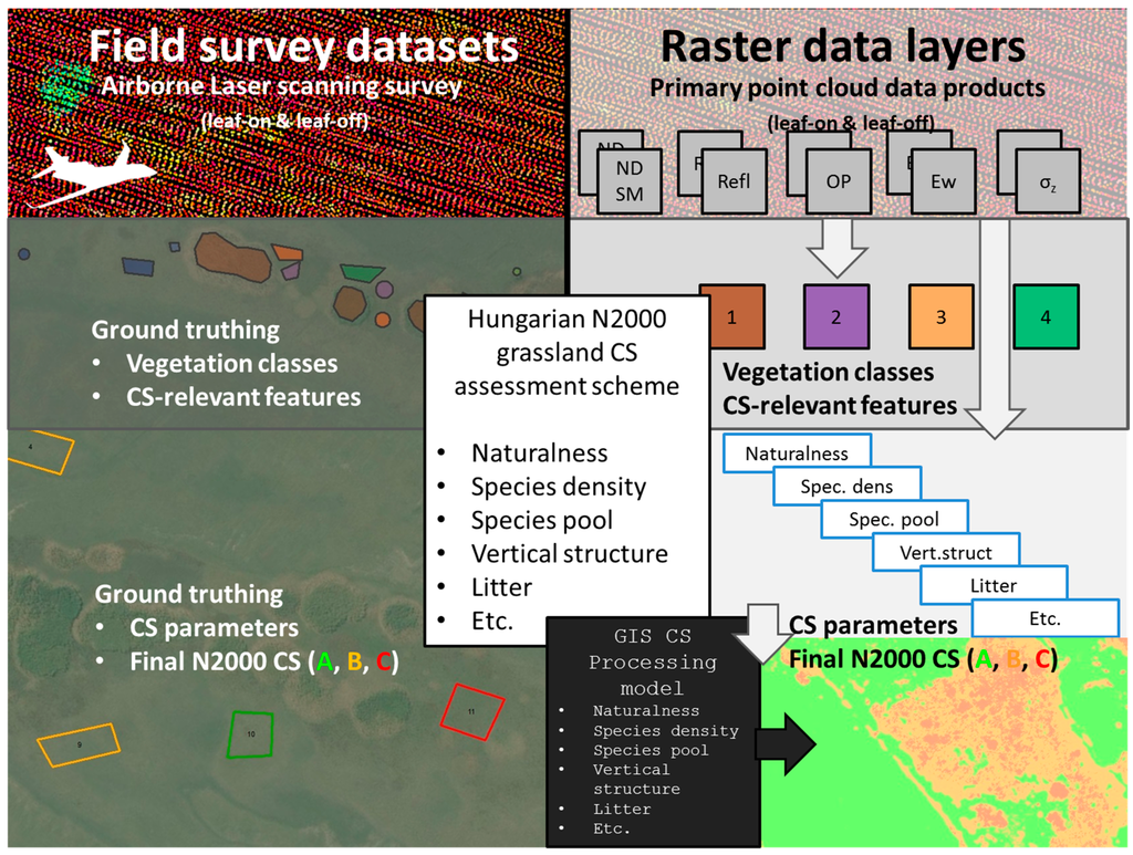 Corbane et al. [] conclude that “the use of remote sensing for accurate, detailed and complete conservation status assessment and monitoring of natural habitats, such as required in the European Natura 2000 context, is still rarely exploited in practice”. Our aim was to fill this gap, taking a new approach to the uncertainties associated with defining a HQ model by following the legally binding Hungarian N2000 CS evaluation scheme (hereafter referred to as the “assessment scheme”, please see supplementary material) as closely as possible. Our method was to derive (1) different maps from the ALS data, (e.g., echo width), go further and (2) classify into vegetation types and terrain features (e.g., human disturbance), from these (3) derive the parameters necessary for the N2000 assessment scheme (e.g., species density), and finally (4) use the assessment scheme rules to aggregate those parameters to calculate the Conservation Status (i.e., A, B, or C).