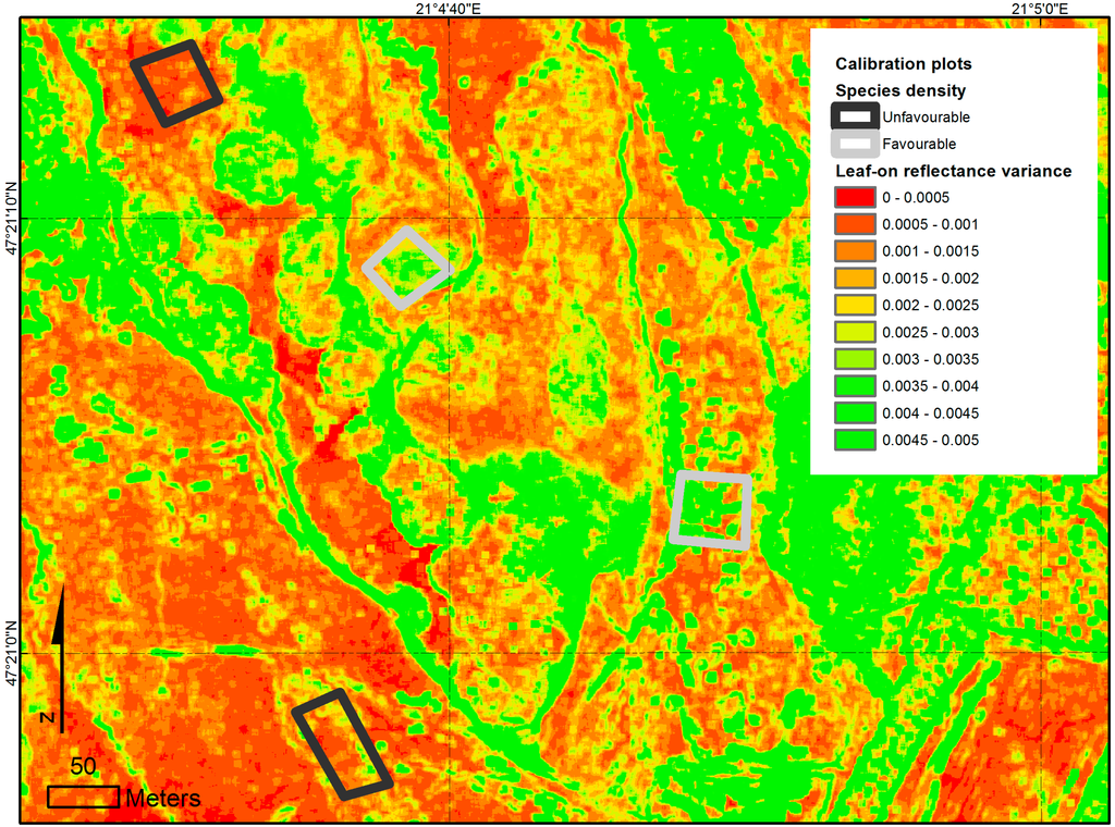 - Litter accumulation: The difference in leaf-on and leaf-off reflectance proved to correspond to the pattern in the litter accumulation of our calibration plots (threshold >0.3 unfavorable). The various levels of negative effects of litter could not be resolved from our sensor data. We assigned either +5 or −1 point to a pixel based on litter accumulation, and classified only the quantity of litter but not its effect (see Section 3.3) Four validation plots had favorable litter quantity and six unfavorable, and all but one (unfavorable) were correctly detected with 79% of all the validation pixels well identified.