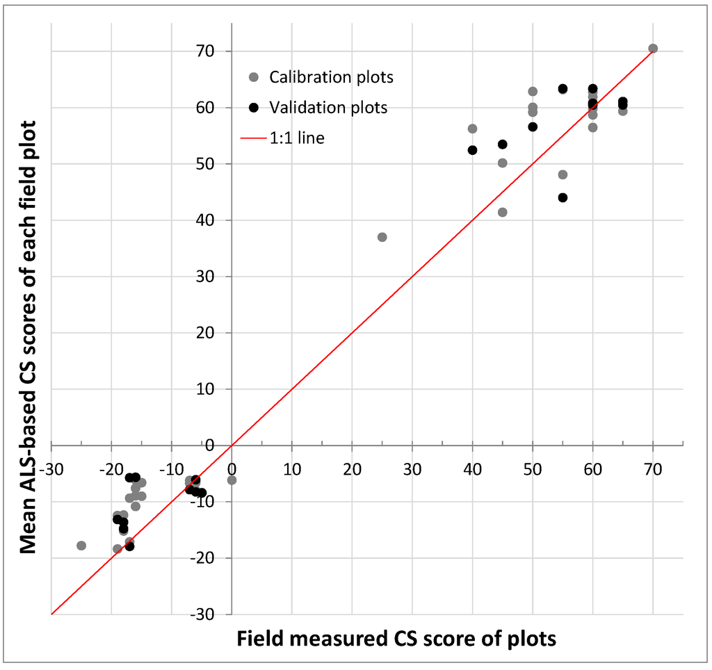 Therefore, the effect of the weighting and evaluation scheme on the final score with respect to the performance of the individual CS parameters was investigated by plotting the ALS-derived summed positive and summed negative CS scores against the respective field-measured scores (Figure 5). For this, the mean of the pixel positive and negative scores within each plot were taken, resulting in 20 positive and 20 negative points in the scatterplot, 10 each from the calibration and validation datasets.
