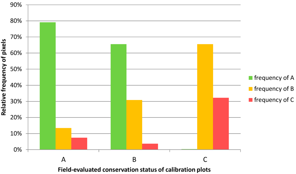 For accuracy assessment, the same relative frequencies of A, B and C class were calculated for the pixels of each validation plot, and the already defined ruleset applied to derive plot-level CS classes based on the ALS data, which were then compared to the field-derived CS category of each plot.